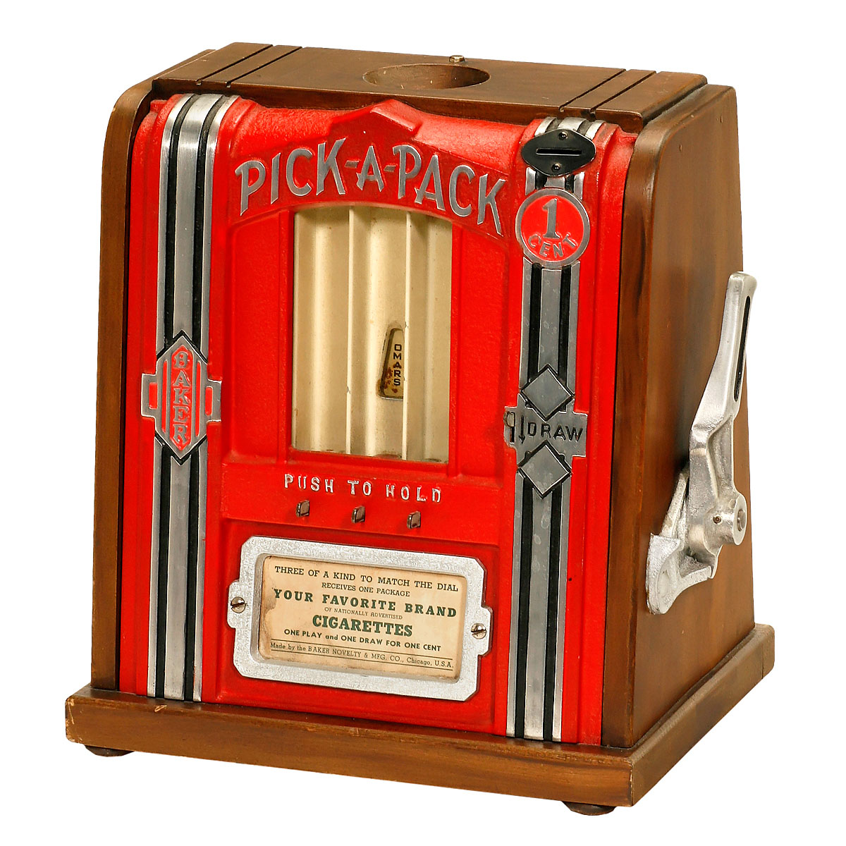 Manufacturer: Baker Novelty Co., Chicago. With 3 dices, 1 cent slot, cast-metal front, height 11 2/5 in., with key, working.