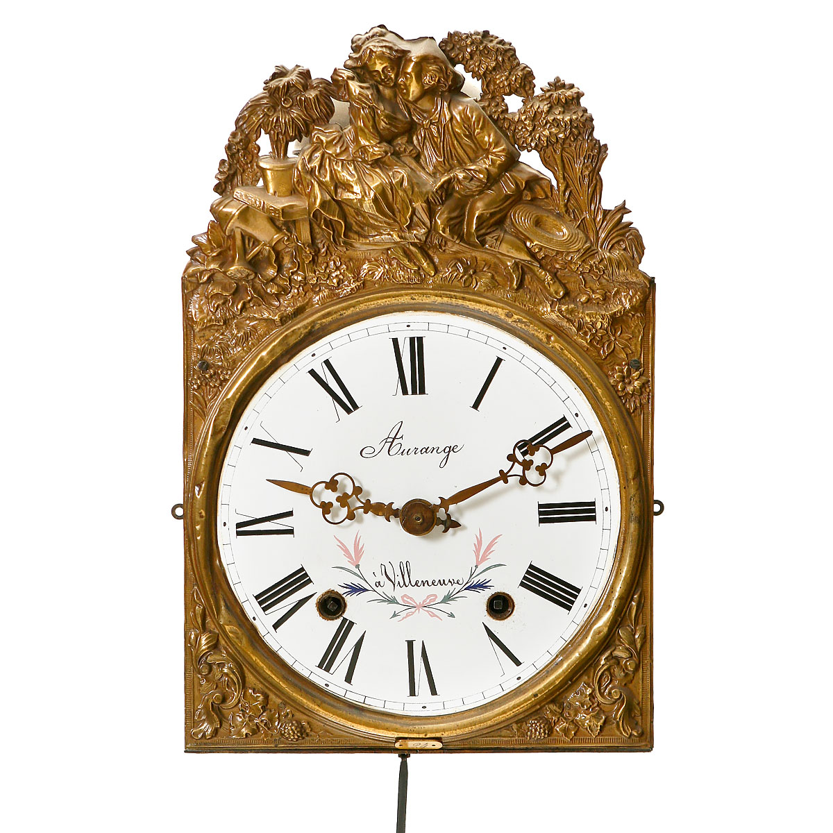 Enameled dial, signed "Aurange à Villeneuve", embossed brass surround, two-train movement, verge escapement, strike on bell, Perspex sides for displaying mechanism, disc pendulum, complete with weights, working (without guarantee).