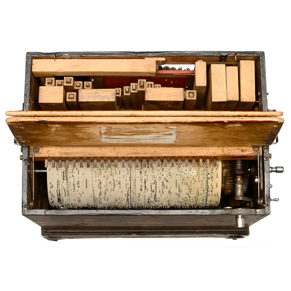 Manufactured by "Ivan Viktorovich Nechada, Balkovskaya No. 191, Odessa" (written in Cyrillic), 25 notes, pinned wooden barrel for 8 melodies, 3 stops, front with 14 exposed panflutes, flue pipes and bottom pipes, extensively veneered and inlaid case, with 3 oil paintings, height 22 in., width 19 in. (56 x 48 cm), traditional Ukrainian and Russian melodies, in good playing condition. A Bacigalupo-style barrel organ.