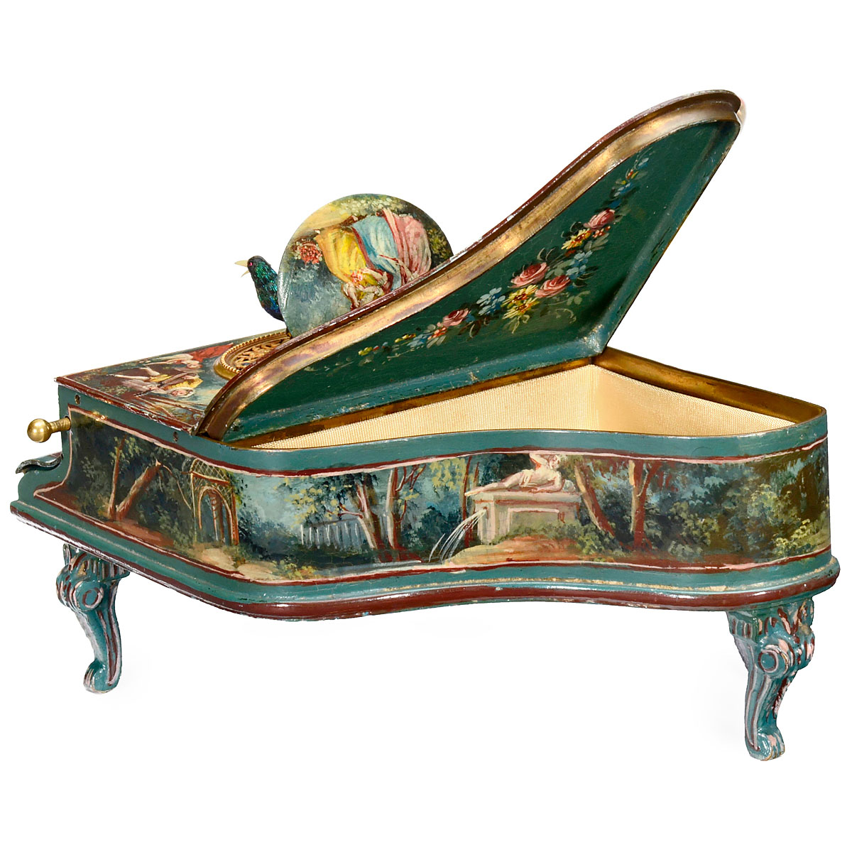 Probably by Flajoulot, Paris. With going-barrel movement, iridescent plumage, moving beak, wings, tail and perch, in painted metal case formed as a grand piano with hinged keyboard cover and fall-board, silk-lined key compartment and floriate-pierced grille, the inner lid decorated with a spray of flowers on viridian ground, the case and outer lid painted with scenes of courting figures, musicians and ladies à la Watteau, the sides with Arcadian landscape of ornamental buildings, fountains and statuary, on cast and painted brass cabriole legs, ht. 2 ½ x wd. 3 ¾ x lg. 6 in. (6,5 x 9,5 x 15 cm), missing feathers on one wing. With brass bird-form key. – The mood and style of the decoration recall the 18th century French lacquer technique Vernis Martin (made by adding bronze or gold powder to green varnish) found on painted interiors, furniture and luxury articles such as brisé fans and snuffboxes. Though developed to imitate the East Asian lacquered goods popular during the reign of Louis XV, the traditional palette of blues, green and ochre also echoed the grand, yet sombre, landscapes of the painter Claude Lorrain. – A strikingly designed singing bird box, possibly a special commission retailed by Juvenia.