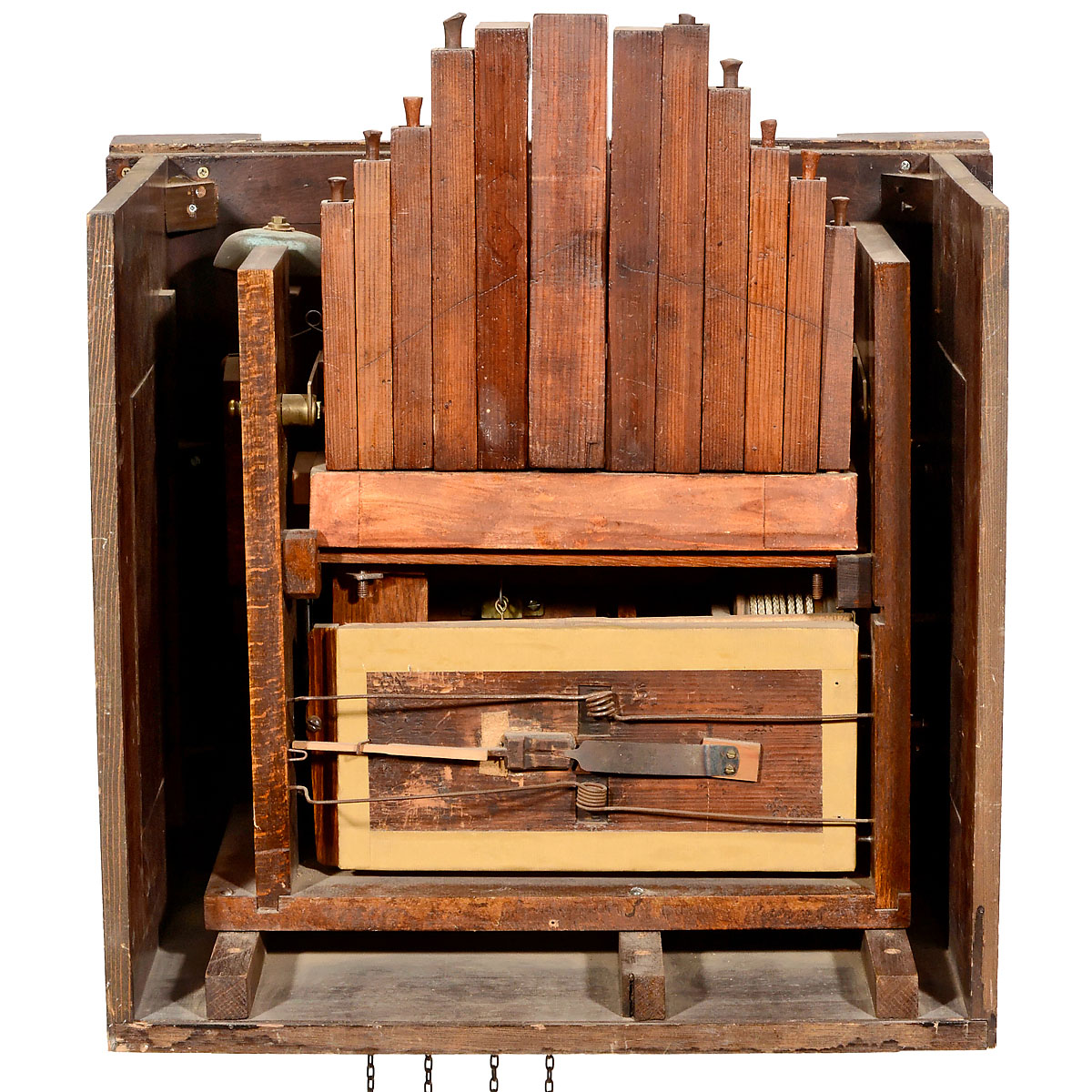 German, weight-driven 22-key movement with pinned wooden barrel for 6 tunes, 2 ranks of wooden pipes, brass weight-driven mechanism in wood plates, hour strike on bell with subsequent activation of the musical movement, good playing condition.