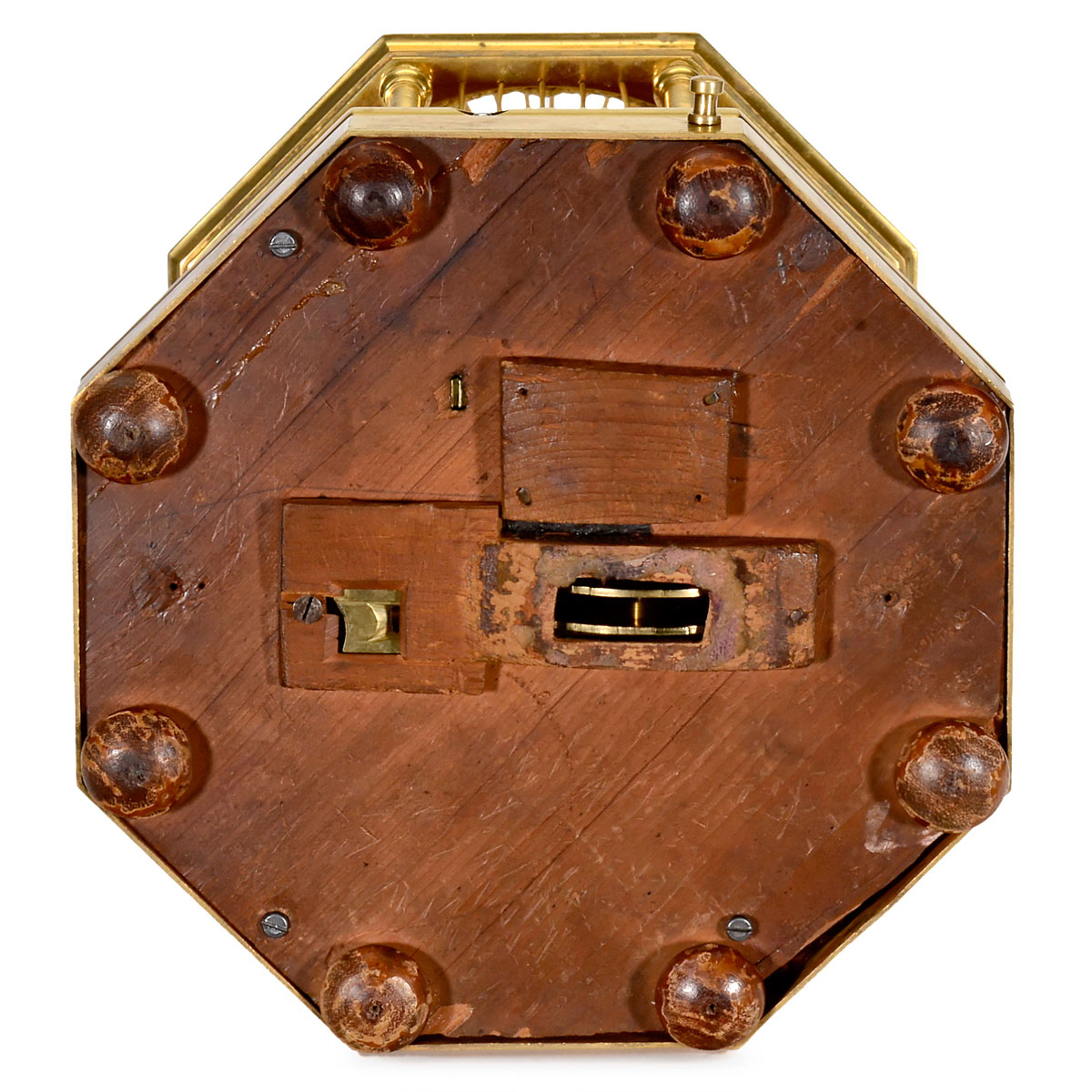 Bird with iridescent two-tone black-tipped green plumage with red tail and wing feathers, realistically modeled brass feet, articulated head, beak, wings, tail and swiveling perch, on t-form perch with leaf-cast boss, in two-tier gilt-brass 'fountain' cage supported by barley-twist pillars with finials, on octagonal ogee base with mahogany underside and bun feet, with going-barrel movement, cams for warbling song with slight pause, bellows and whistle, ht. 16 in. x wd. 9 in. (40,5 x 23 cm). With large heart-shaped key. – A most unusual transitional singing bird automaton in an elegantly designed architectural cage. Not only does the bird move its beak, head and tail (in the manner of most singing bird automata), it also flutters his wings and appears to hop from side to side inquisitively as it sings. – These additional movements recall the miniature birds in fusee-driven precious metal and enamel automaton boxes produced during the early 19th century by Rochat and Bruguier. The modeling of the bird itself is also reminiscent of an early fusee-driven automaton bird created on a larger scale. This is the only example of its kind that we have seen to date.