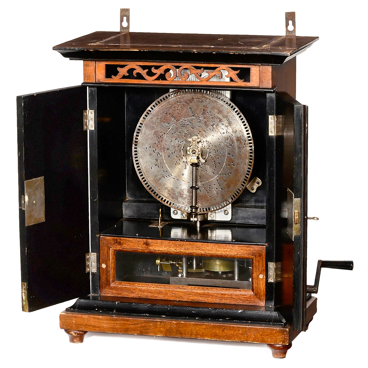 Manufactured by Barnett Henry Abrahams, Ste. Croix, Switzerland. For 9 1/8 in. discs with peripheral drive, 80 teeth in duplex comb (complex), wooden case, 2 opening doors with boxwood stringing, sound opening, very good playing condition, with the typical full and loud Britannia sound. With 9 discs.