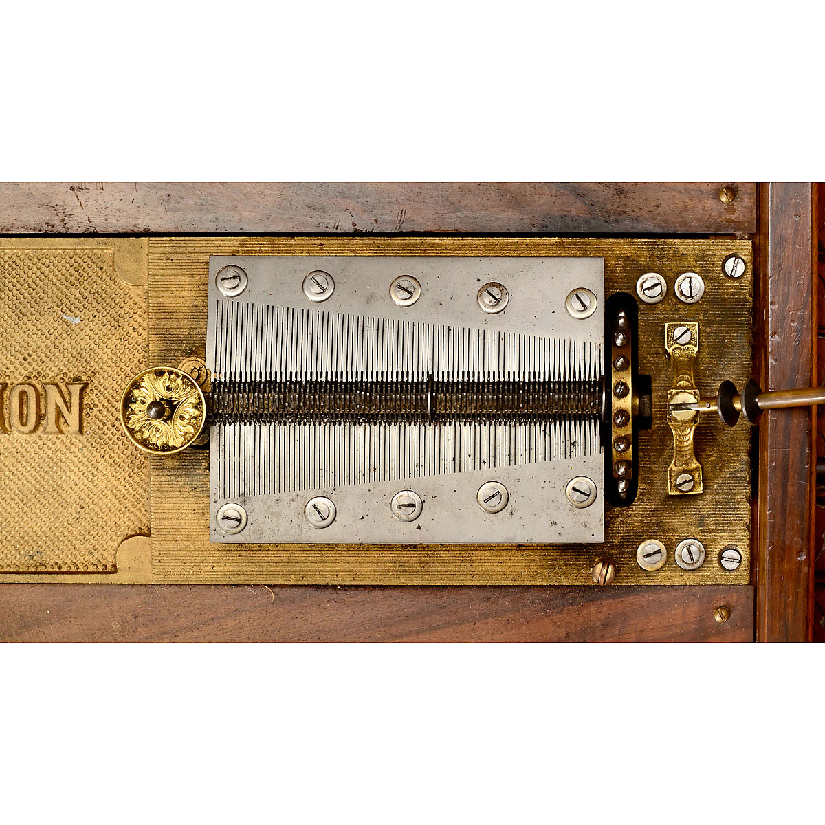 For 15 3/4-inch discs. Manufactured by Polyphon Musikwerke, Leipzig. 154 teeth in duplex comb, complete! Walnut case with elaborate carvings, original lithograph in lid, "Polyphon" inlaid in brass letters under the lid, very good original condition. With 10 discs! Excellent playing condition. One of the most beautiful Polyphon table models.