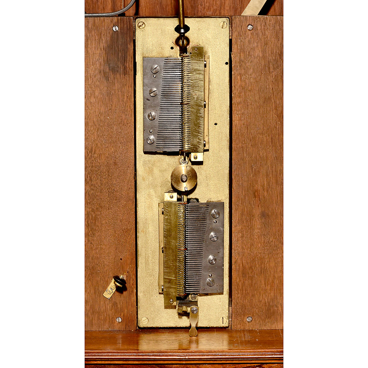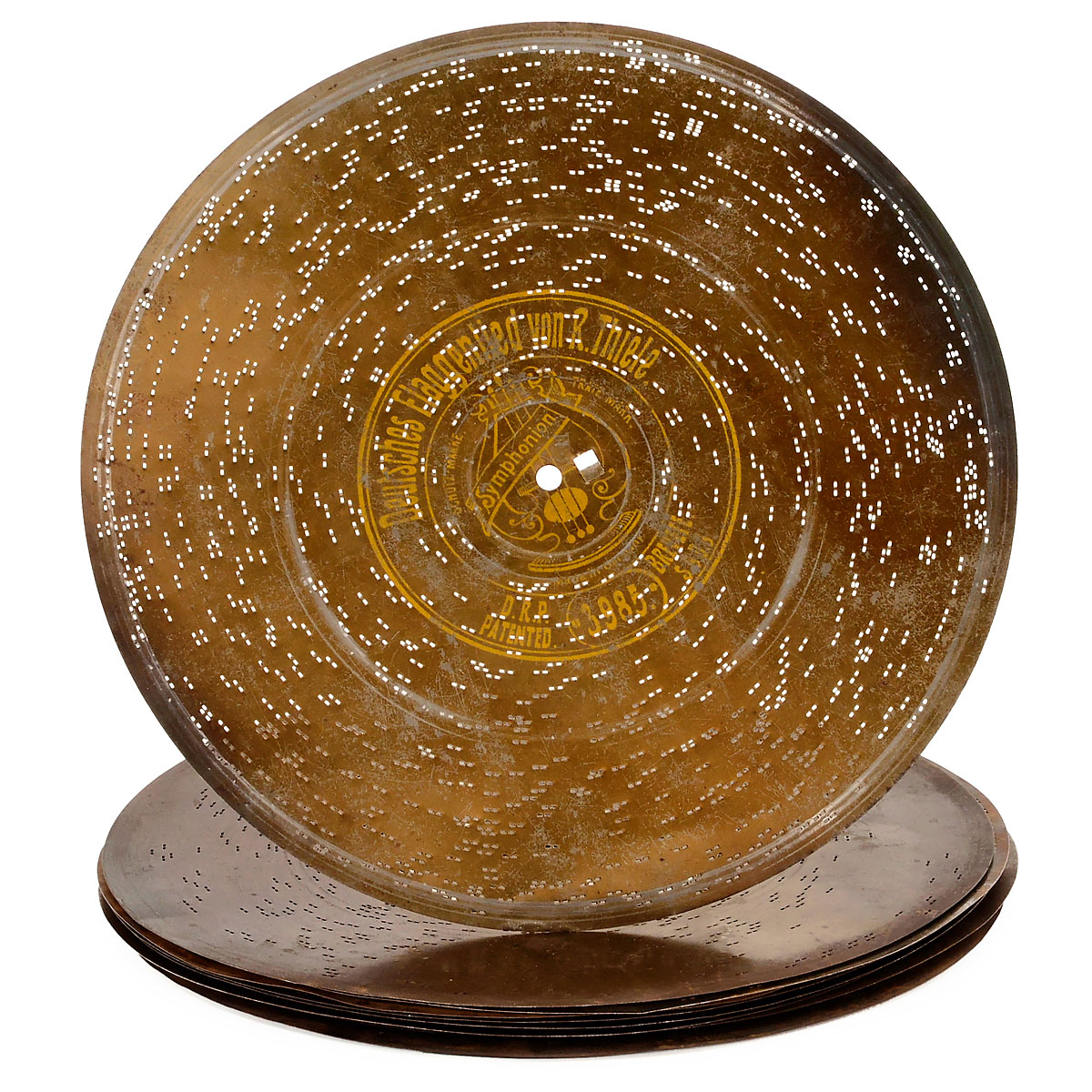 Musical movement by Symphonion Musikwerke, Leipzig. For 11 ¾ in. discs, 84 teeth in duplex comb, complete!! Clock in top gallery, striking on bell and setting the music on every hour (changeable to silent at night), walnut case made in Czechoslovakia 40 years ago after an original "Symphonion Hall Clock", dimensions: 23 ½ x 14 x 80 in. With 11 discs. – Good playing condition with excellent sound!
