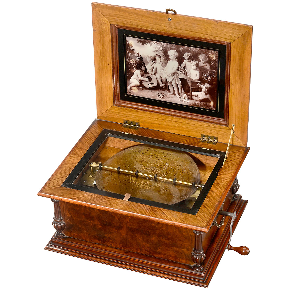 11 ¾ in. disc musical box by Symphonion Musikwerke, Leipzig. Walnut cabinet with brass handles (19 5/8 x 15 x 10 1/5 in.), inner lid with glazed lithograph, 84 teeth in double comb (complete!). With 10 discs. Good playing condition, dampers needs adjustment. Very good unrestored original condition.