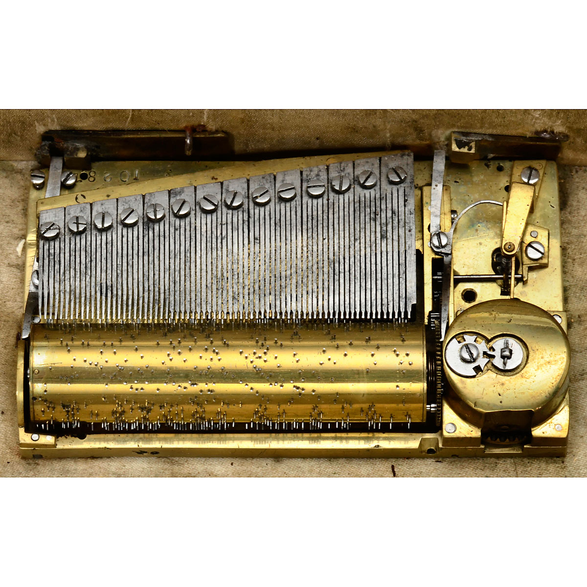 With two-air sectional-comb movement, No. 10287, with fourteen groups of five teeth (complete), fitted velvet-lined tray containing mother-of-pearl and gold-plated tools: thimble, four spools, scissors, stiletto, tambour hook, awl and a glass scent bottle, in beveled rectangular satinwood case with cut-steel decoration, mirror and handle on lid, 8 ¾ in. (22,3 cm) wide, two of the reels repaired or possibly replaced, missing one pair of scissors. An elegant musical necessaire in fine playing condition.