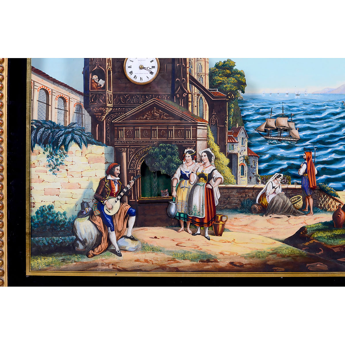 Paris, hand-colored lithograph depicting a harbor scene with abbey, fountain, ships on three planes and a watchtower on a hill, with two-train clock movement and enameled Roman dial both marked "Gent & Co., Baker Street Bazar", large key-wind four-air cylinder movement No. 9932, operating instructions and going-barrel automaton movement, in giltwood and gesso frame, ht. 38 ½ in. x wd. 47 in. (98 x 119 cm) framed, image approx. 25 x 33 in. (63 x 84 cm). – The movement activates: nodding friar reading in a tower room, musician nodding his head as he strums a lute and taps his foot, twisting glass rod in the fountain, a mouse hiding in the well, a lady mending net by the harbor wall, a fish swimming by the harbor wall, a rocking ship in the foreground, two more tossing on rolling waves on the middle ground, a steamer and a sailing vessel crossing the horizon and the flag on the watchtower fluttering in the wind. – Although Tharin produced mechanical pictures in series, he incorporated variations in the movements and backgrounds. This particularly complex example features an extra set of ships and gently rolling waves in place of the usually-seen viaduct, requiring an expanded middle ground – and larger overall proportions – to accommodate the additional scenery. – For comparison, see Auction Team Breker, 25 May 2013, lot 430 and 7 November 2015, lot 611. – A large and handsome automaton picture clock, in good working order!