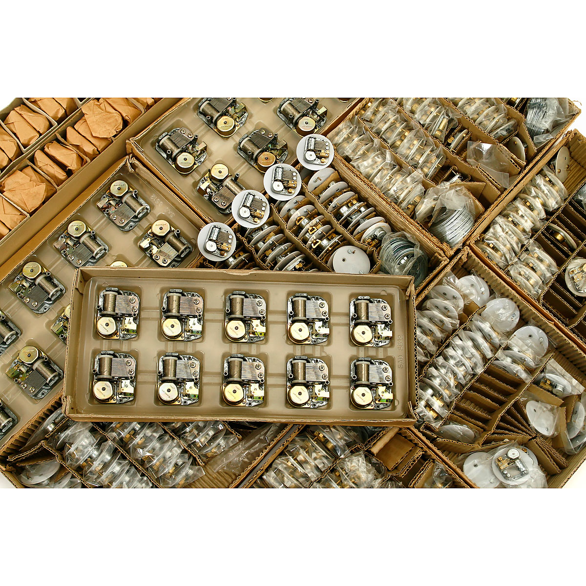 36 x 18-note Swissco movement in two shipping boxes; 29 x 18-note Sankyo Seiki Co. movement in three shipping boxes; and approx. 150 x 12-note miniature Sankyo movement for musical bottles, cups etc., in packing boxes. Untested. Old, usable shop stock.