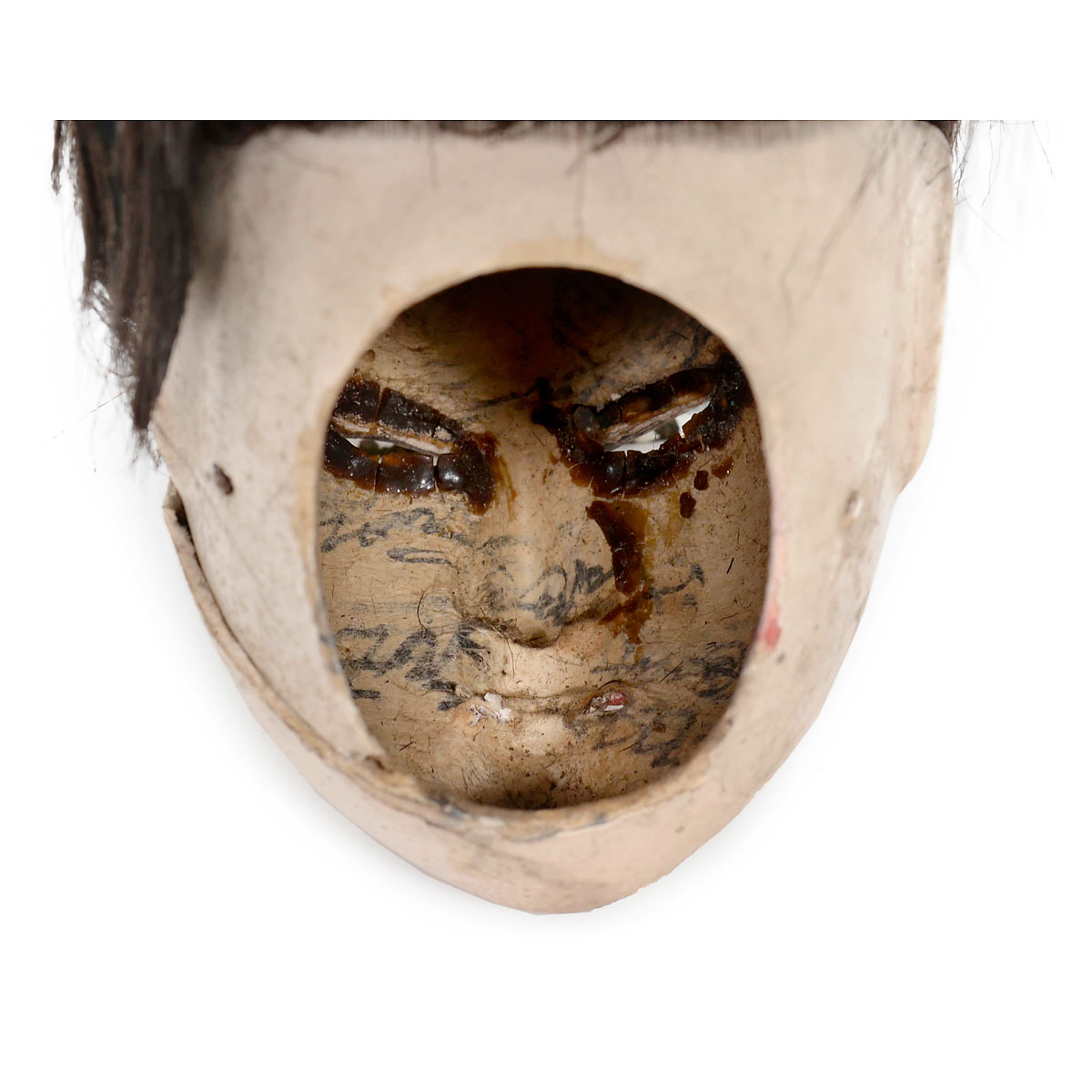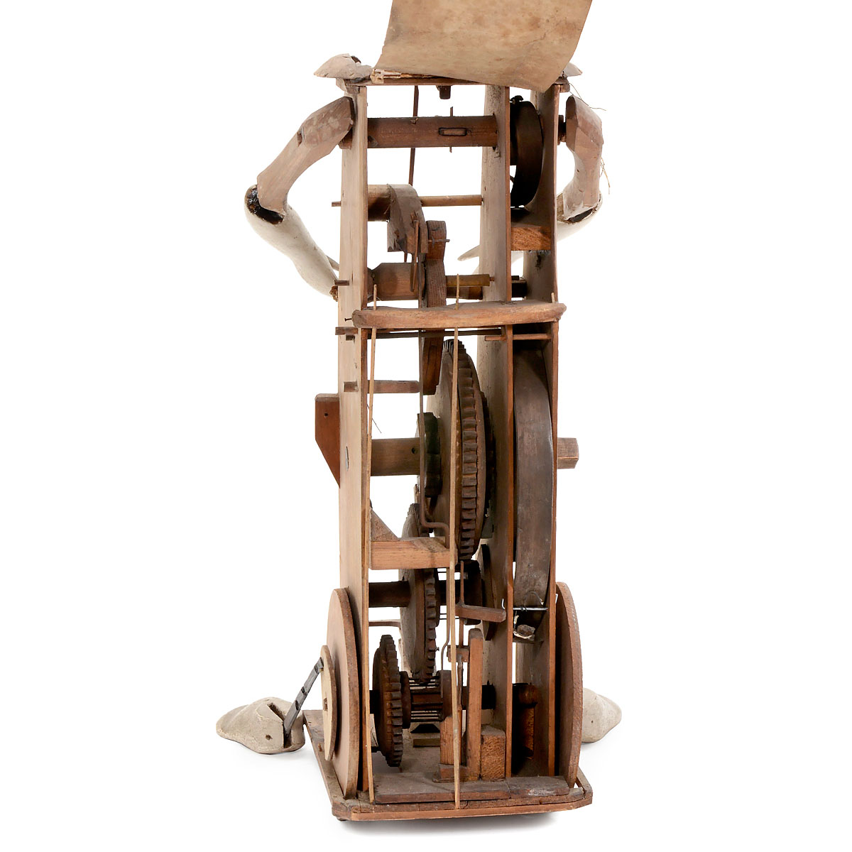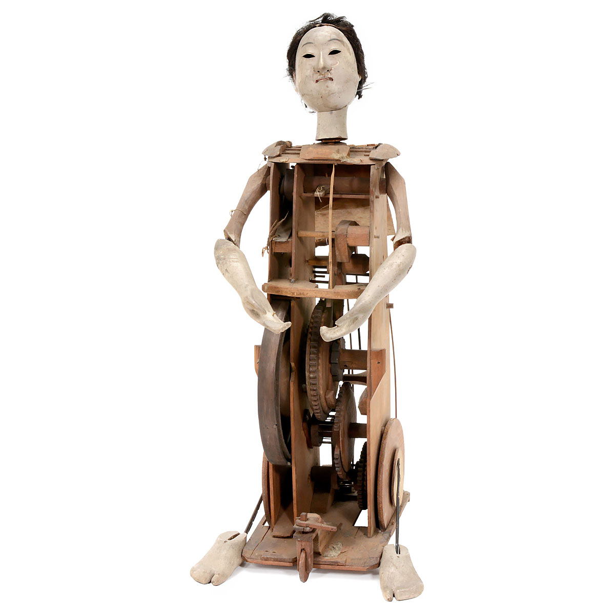 Japan, with pivoting pin-jointed papier-mâché head, original gofun finish, fine brushstrokes for the eyebrows and strands of hair on the forehead and temples, original hair wig arranged in top-knot, carved wood body with stained-bone open-spring motor driving three wood gears, two 4 ½ in. (11,5 cm) diameter wheels for movement of the feet, 1 ¾ in. (3,4 cm) diameter front wheel and a stepped runner for the arms which are fitted with a coiled bone assist-spring for upward and a weighted rod for downward motions, the interior of the head and card cover on the back of the body with ink inscription, ht. 19 in. (48,5 cm), missing eyes and tray, inoperative. With fragments of hollow wood saucer. – The Japanese art of the "Karakuri Ningyō" (or mechanical dolls) stretches back to the end of the Muromachi period (1333–1568) when the first timepieces from Europe arrived on Western ships. During the isolationism of the Edo period (1603–1868), Japan developed and refined its domestic mechanical technology through the imagination and technical artistry of successive generations of craftsmen. – "Chahakobi Ningyō", or the tea-serving doll, is arguably Japan's first 'home entertainment robot' . According to the classification of the JIRA (Japanese Industrial Robot Association), the tea-server is a "fixed sequence" robot. When a cup of tea is placed on the figure's tray (now missing), she advances across the table to the waiting guest. Removing the cup halts her progress and replacing the empty cup on her tray causes her to turn around and walk back across the table to the host. – "The tea-serving doll is not only excellent from a mechanical perspective, but it also displays an intriguingly human essence. Historically, its existence provided entertainment and functioned as a way of deepening communication between a host and guest." (www.karakuri.info). – Satō Narumi's article "The Dolls that Sparked Japan's Love of Robots" provides a short history of the "Chahakobi Ningyō", one of several mechanical dolls built by the 17th century watchmaker Takeda Kiyofusa and illustrated in Hosokawa Hanzō Yorinao's work "Karakuri Zui" ("An Illustrated Compendium of Clever Machines") of 1796. – The book was revolutionary in many ways. Not only was it Japan's first text on mechanical engineering, it also revealed the secret construction techniques of Karakuri automata traditionally only passed from master to apprentice like ancient mysteries. "The logic of the parts had to remain a mystery if the real point of the device – the discrepancy between inside and outside, input and motion – were to be enjoyed." (http://www.karakuri.info/master/index.html) – Contemporary Karakuri maker Han'ya Harumitsu argues that "the publication of his book is the point of departure for the journey that has led up to Japan's status today as a pioneer in robotics". There is a fundamental link between the mechanical dolls of the Edo period and contemporary Japanese technology. "The way that these dolls employ gears and other clever techniques to control and redirect the clockwork motion has something in common with how modern robots are directed by computer programs." – A rare and important document in the development or automata and robotics. – References: Andrea Robertson (1992), "Museum of Automata" catalog, pp. 55–57; Satō Narumi (2013) "The Dolls that Sparked Japan's Love of Robots: http://www.nippon.com/en/views/b00907/; Mami Maruko (1999) "On the cutting edge of Edo Technology": http://www.japantimes.co.jp/community/1999/10/30/general/on-the-cutting-edge-of-edo-tech/#.V9-qYTXjSSo; and http://www.karakuri.info/master/index.html for a biography of Karakuri makers.