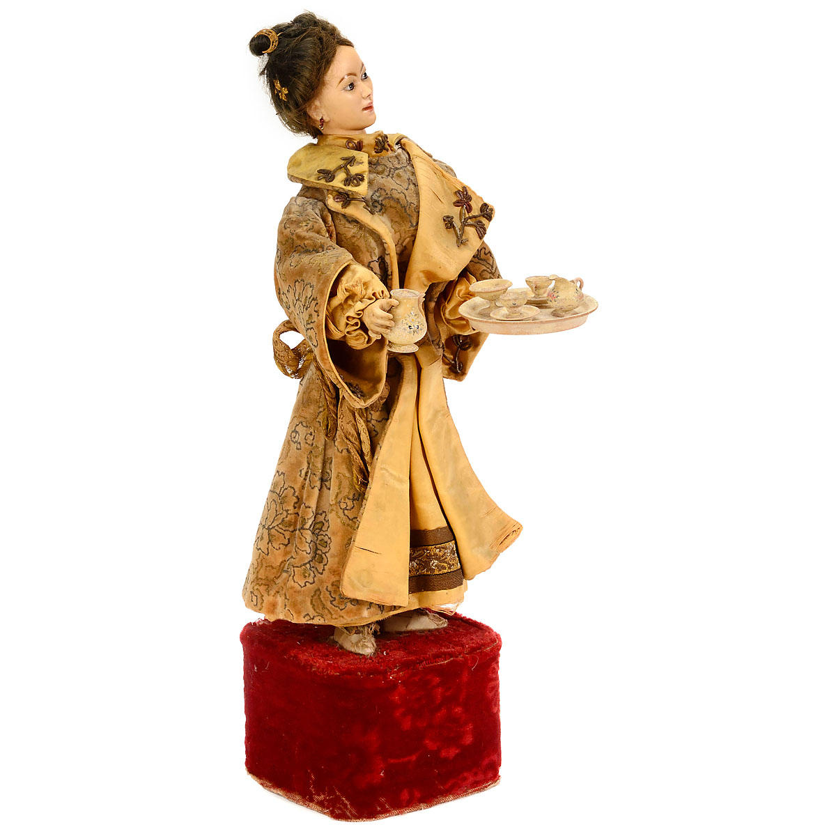 With unsigned Jumeau bisque character head modeled as a young Chinese woman with amber-tinted complexion, slender neck, high forehead and cheekbones, closed smiling mouth, fixed brown glass eyes, pierced ears with earrings, original black mohair wig with gilt-metal ornaments, bisque hands holding a painted wood teapot and tea-service on a tray, on velvet-covered base with going-barrel movement playing a single air ("Les Cloches de l'Eisenbarth") as the figure turns and gently bows her head to the left and right, then lifts and tilts the teapot as though pouring into the cups which she proffers with a horizontal movement of her left hand. – Dressed in the original asymmetrical floral-printed velvet kimono with pagoda sleeves, gold satin underskirt and metallic appliqués, ht. 18 ½ in. (47 cm), left hand repaired – mostly covered by the tray. With brass key monogrammed "LB" and tune-sheet. – A fine automaton in good working condition and original dress. The beautifully modeled bisque head, described in Lambert's catalog as a "tête caractérisée", was presumably an exclusive commission from the premier French doll-maker, Emile Jumeau, since this particular face is found on Lambert automata alone. The decoration is similar in style to a series of dolls representing different nations produced by Jumeau for international exhibitions during the 1880s. – Literature: Bailly, "Automata, the Golden Age", p. 348; Auction Team Breker, 19 November 2011, Lot 425, for a similar piece.