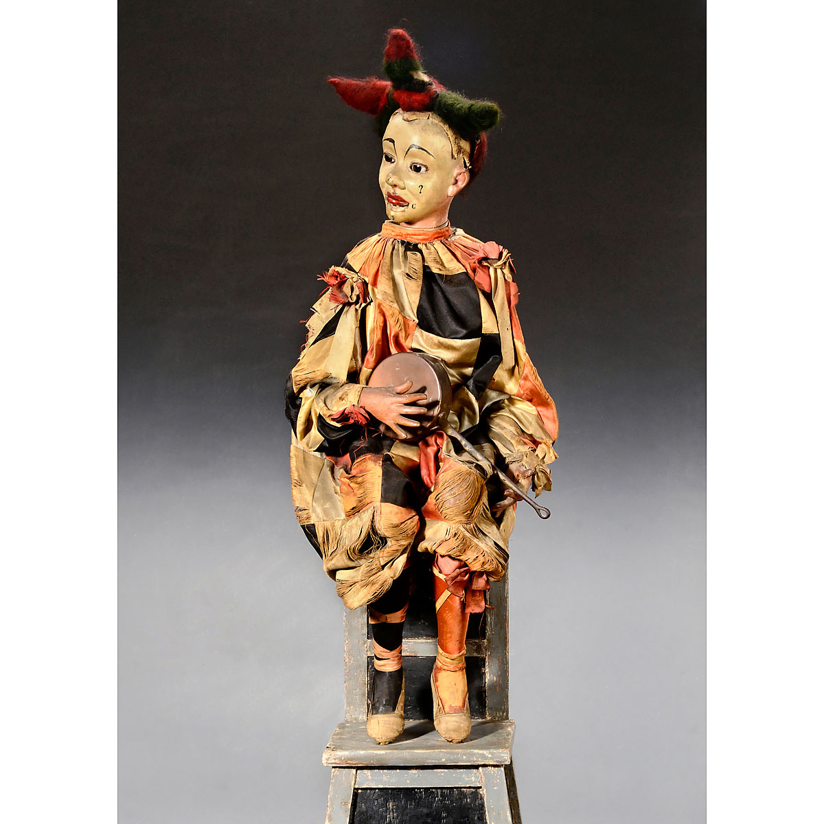 Modeled as a quizzical character holding a copper casserole pot as though it were a banjo, with plaster-composition character head decorated with exclamation and question marks on the cheeks and the letters "A", "B", "C" and "D" on his chin and nose, with brown glass eyes, articulated eyelids, lower lip, three-point mohair wig, shoulders, hands, casserole and lower legs, the chair containing large going-barrel motor driving seven cams and cylinder musical movement, dressed in original rosette-trimmed satin harlequin costume, ht. of figure 33 in. (84 cm) to tip of hair, overall 40 in. (1 metre, 2 cm) or 43 in. (1 metre, 10 cm) including the hair, (movement of head sticking, leather split on eyelids and lower lip, usual wear to costume, lower back-door of chair replaced). With brass acorn-form stop/start and large wrought-steel key. The Vichy catalog describes the "Eccentric Clown" as a "pièce trés original" with "lively and animated" movements. He certainly makes an eccentric and original performance as he looks from side to side, lifts the casserole like a banjo and beats it audibly like a drum. The clown accompanies his performance by clicking his heels together, singing (movement of the lower lip), blinking and shrugging his shoulders melancholically as his hair, taking on a life of its own, bounces up and down upon his head! – Literature: Bailly, "Automata, the Golden Age", p. 248 for Vichy catalog and Hillier, "Automata and Mechanical Toys", p. 137 for contemporary illustration. – Vichy's "Eccentric Clown" was illustrated by Emile Bayard alongside the "Lune Fin de Siècle" and "La Marchande des Masques" for Léo Claretie's "Les Jouets, Histoire – Fabrication" in 1893. Clowns playing unusual and impractical objects – such as brooms, dominoes and frying pans – as musical instruments make occasional appearances amongst Vichy's automata, however this is the only example of the "Eccentric Clown" that we have seen to date. It represents the artistic collaboration of Gustave and his son Henry Désiré Vichy and has the same facial modeling and proportions as "Bob et son Cochon Savant" ("Bob and his Learned Pig"). Measuring over 1 metre in height, it was one of the largest automata offered in the Vichy catalog. Discovered with Lot 518 in a Mexican estate, the automaton is presented in rare, original working condition and would benefit from very careful cleaning to improve its mechanical functions. A rare and significant Vichy automaton!