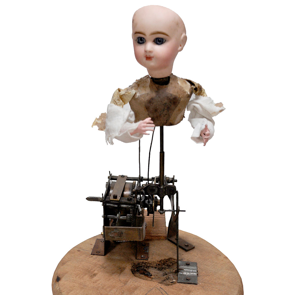 Depicting a pastry cook hiding in a brioche, the cook with Jumeau bisque head stamped in red "Déposé Tête Jumeau, Bté. S.G.D.G. 1" and artist's marks "H7", closed mouth, fixed blue paperweight eyes, feathered brows, pierced ears, blonde mohair wig on cork pate, painted metal hands holding a 'tartine', cream silk suit and matching hat, the molded papier-mâché brioche with hinged lid. Single-air going-barrel movement, ht. closed 9 ½ in. (24 cm), ht. open 14 ½ in. (37 cm), good working condition. With size 11 steel key. – The lid of the brioche opens as the cook rises, turns his head, lifts the tartine and then, as abruptly, vanishes as the lid snaps to. – Roullet et Decamps specialised in the production of 'surprise' automata concealed in everyday items: rabbits in cabbages, children in roses, a Mandarin in a tea urn and a pastry cook in a brioche. Here the illusion is heightened by the realistic modeling and painting of the brioche and the innocent expression of the child-like pastry cook. In French cuisine, the "Pâté surprise" (or "Pain surprise") is a pastry casing filled with cut sandwiches, the traditional accompaniment to champagne at wedding reception. – "Pâté Surprise" is a rare automaton that appears neither in the Roullet et Decamps' sales catalog nor in the firm's record of molds, suggesting an early model that was never put into large-scale production. – Literature: Bailly, "Automata, the Golden Age", p. 128 for a similar piece. – Provenance: Decamps collection. Accompanying the automaton is a copy of a letter from Cosette Decamps-Bellancourt, describing the discovery of antique clockwork automata from her grandfather's (Jean Roullet) era in a disused room of 10 Rue du Parc Royal, Paris, during renovation work in 1960–61. – A rare and magical automaton.