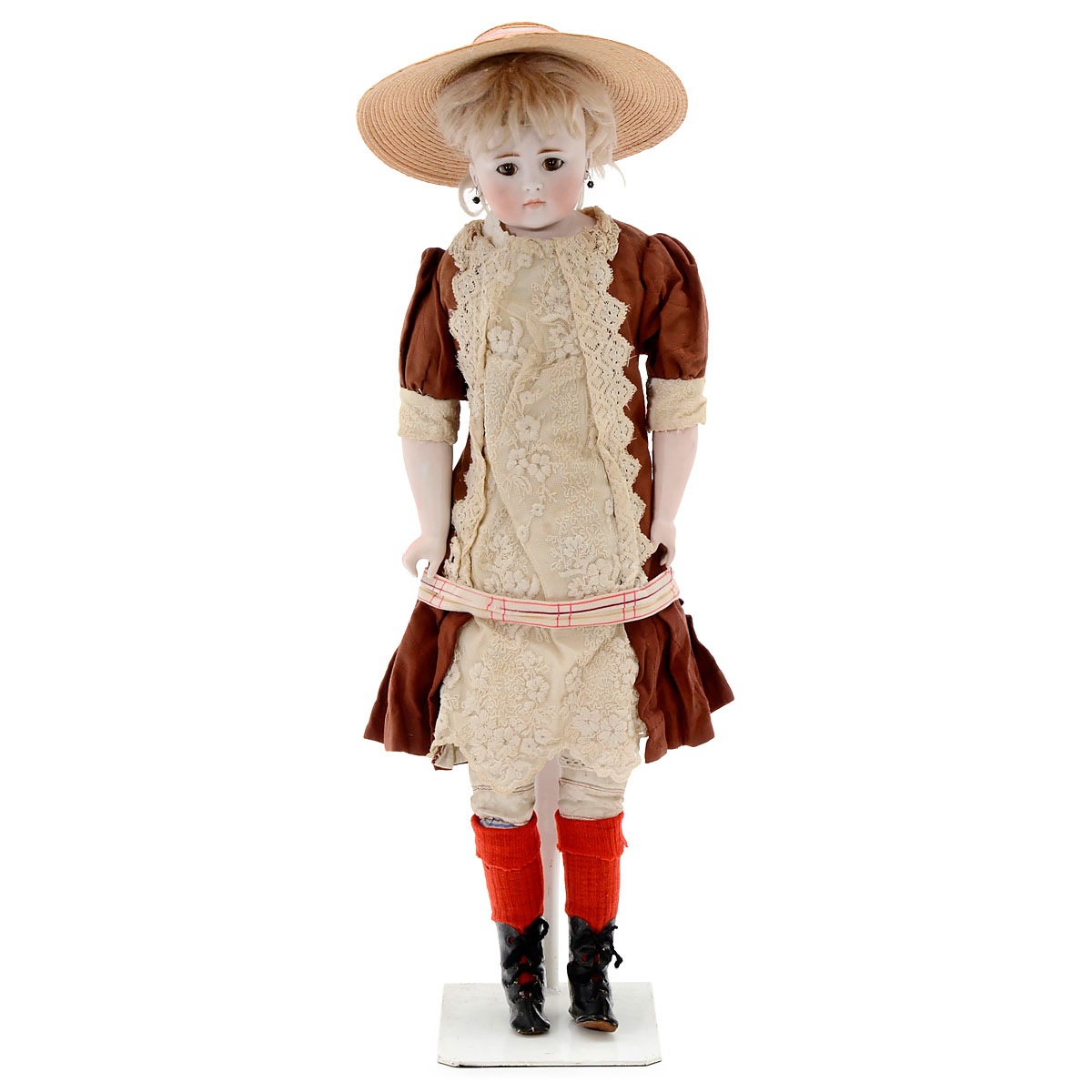Germany, impressed on shoulder-plate "SH 9", with solid domed head, closed mouth, fixed brown glass eyes, pierced ears, blonde mohair wig, cloth body with bisque lower arms (mismatched), contemporary drop-waist dress with lace panel, red wool stockings, oilskin boots and wide-brimmed straw hat, ht. 24 in. (61 cm), scattered freckles in bisque, firing split on right ear lobe, eyes reset. With paper retailer's label (torn): "Lilly Schult, Manufakturhandle, Kullagatan No. 4, Helsingborg". – Attractive doll and costume.