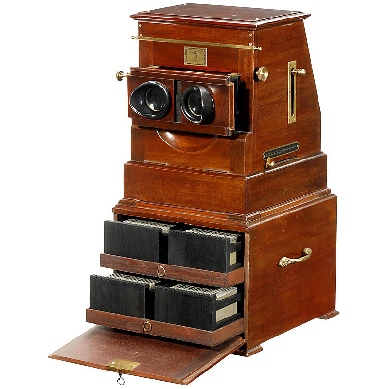 "Stéréoscope Magnetique Planox",法国。桌立木制立体观影器,有片匣驱动装置,图片正片6x13cm,片匣能装20张图片,发条装置聚光,目镜可调,有小的内阁,可以盛放6盒片匣,现有7盒片匣,大约120图像正片,高50厘米。