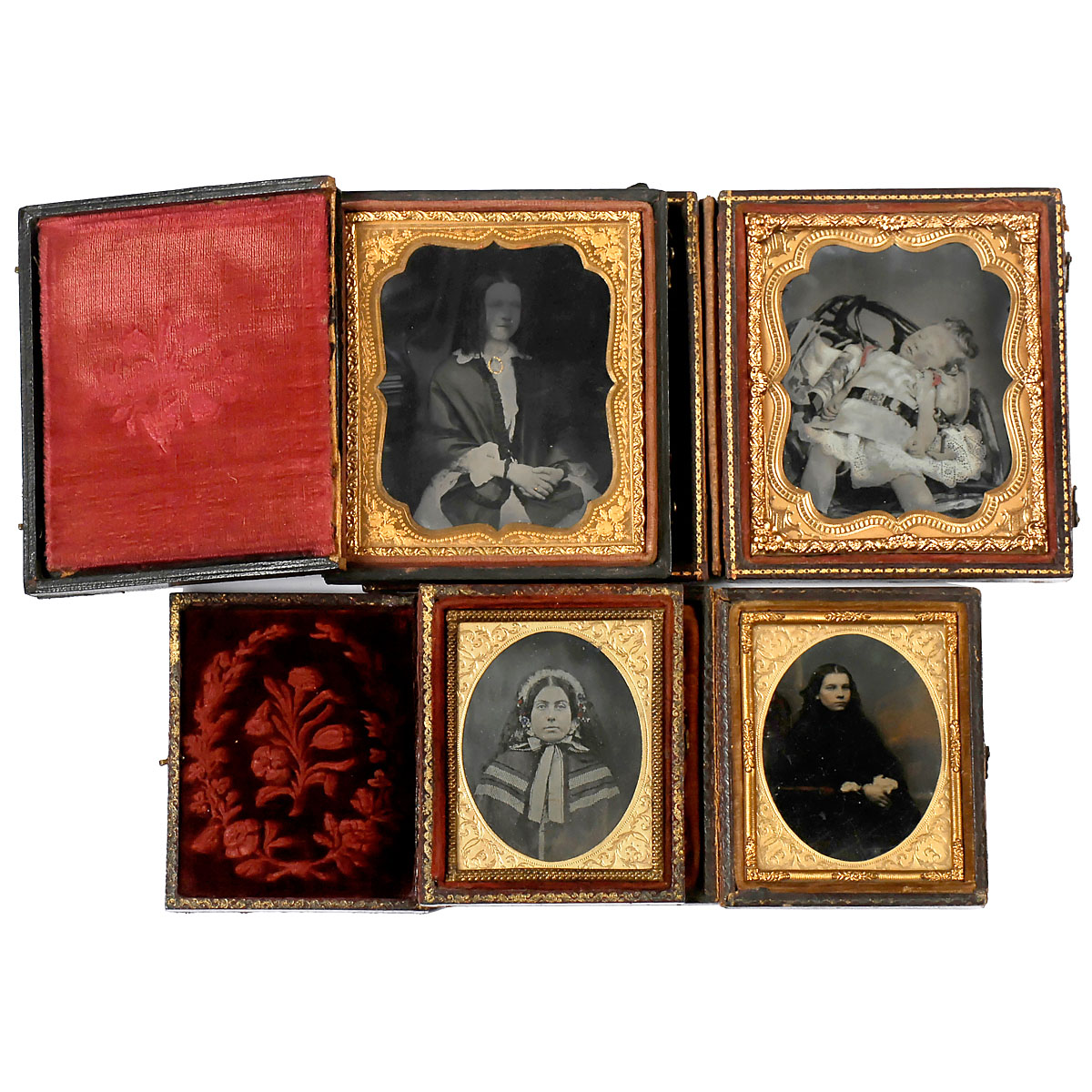 Anonymous. Two 2 x 2 1/3 in. and two 2 ¾ x 3 1/6 in., 3 portraits of ladies and an unusual portrait of a sleeping girl on an armchair, all cased and hand-tinted, three cases with loose covers, two with a floral pattern.