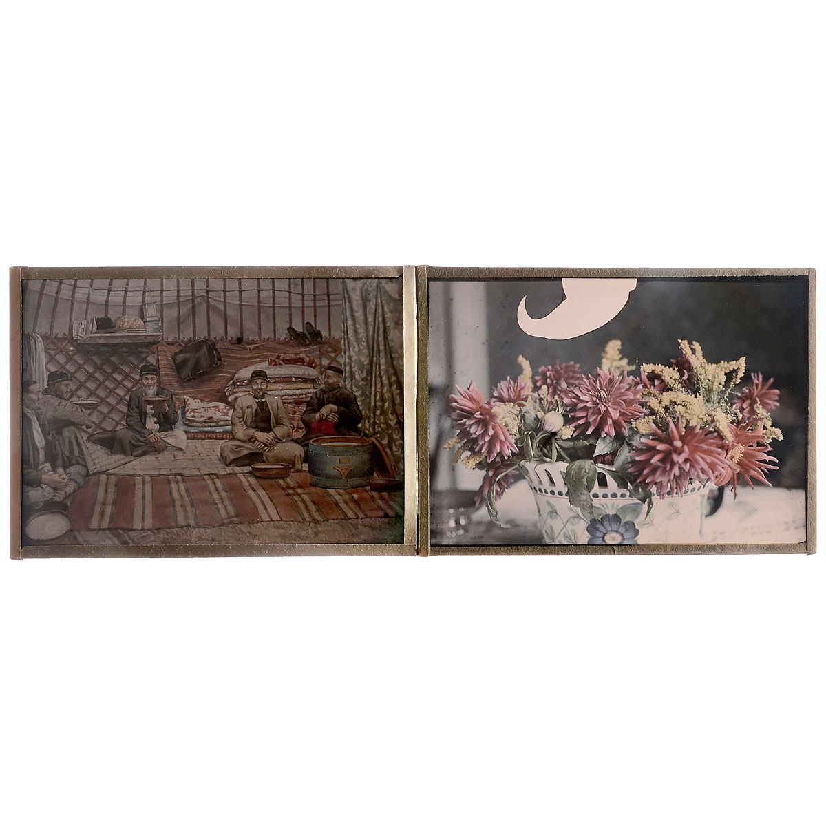 Motifs: reproduction of a picture with 5 mongolians and flower arrangement (partly emulsion missing).