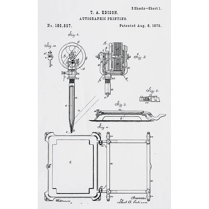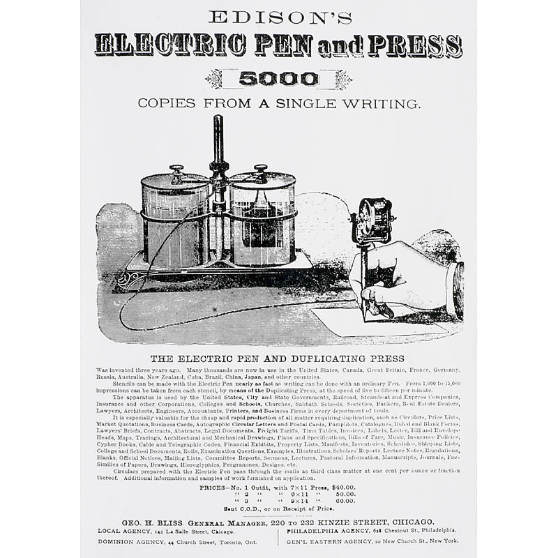 "Edison Electric Pen" 和 "Edison Mimeo graph Duplicator" 1875年