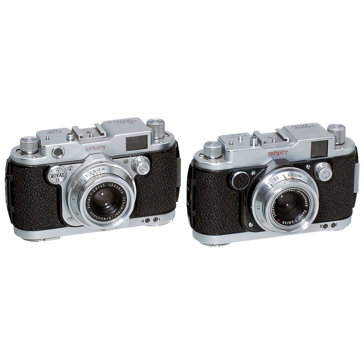 Berning, Düsseldorf. 1) Robot-Royal 36 Mod. III, 1955, 24 x 36 mm, no. Z-137924, Xenar 2,8/45 mm. (3+/2-) – And: 2) Robot-Royal Mod. II, 1954, 24 x 24 mm, no. H-122993, Xenar 2,8/38 mm. (3+/2) – In addition: 2 lens hoods.