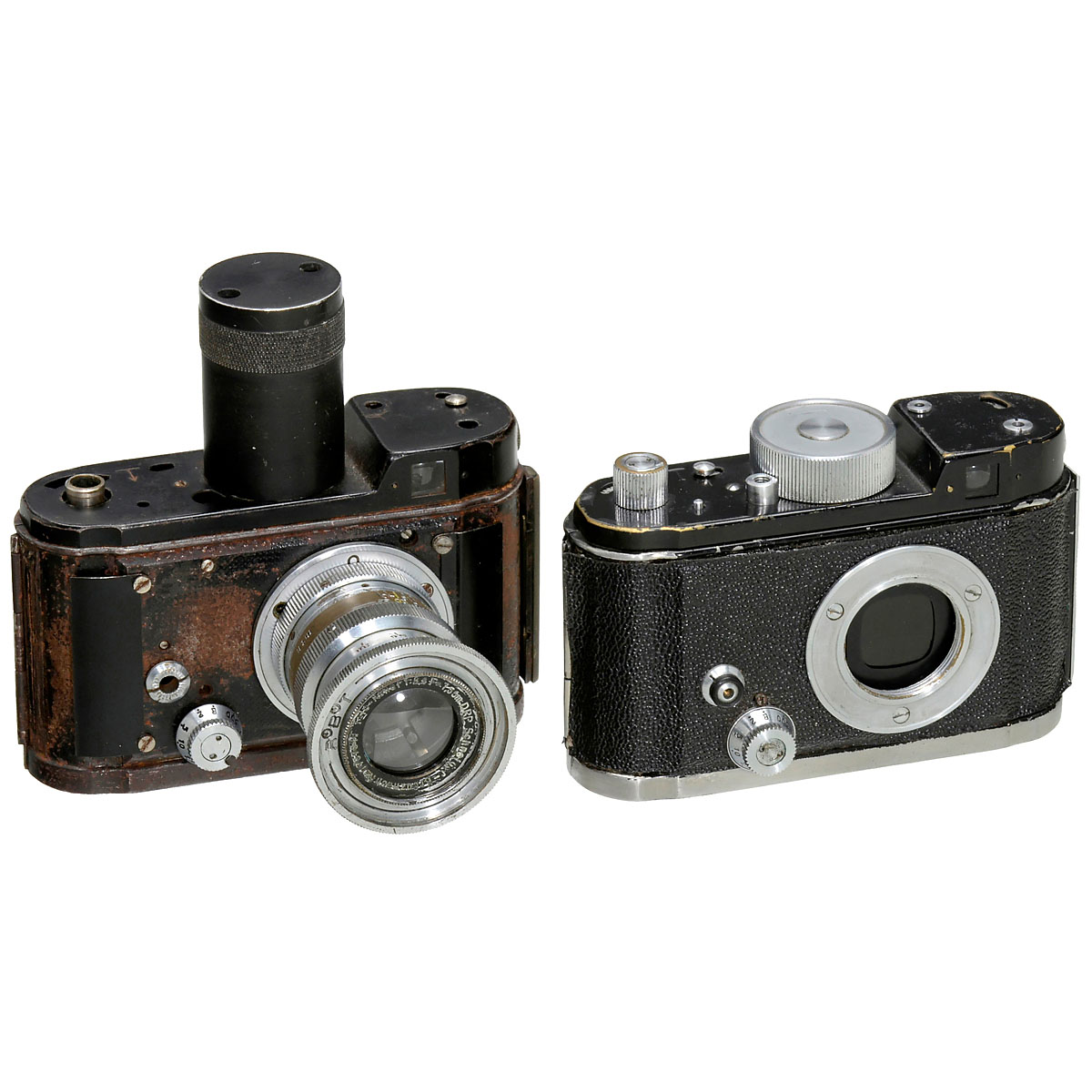 Berning, Düsseldorf. 1) Robot II, 1947, no. B 87367, spring-motor inoperative. Spare part for "Luftwaffen"-Robot (No. 2). (3/5) – 2) Robot II, 1939, no. F 47999-G, "Luftwaffen-Eigentum", defective/missing parts, for restoration only. (5/5) – And: 3) Tele-Xenar 3,8/7,5 cm, with engraving "Luftwaffen-Eigentum". (3–4/3)