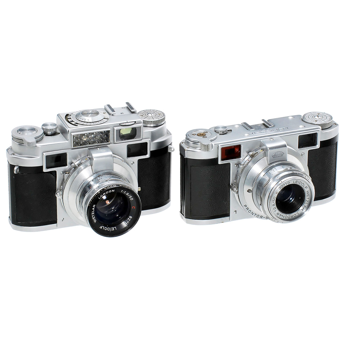 Leidolf, Wetzlar. 1) Lordomat C35, 1956, coupled rangefinder, interchangeable Enna "Lordon 1,9/50 mm" lens, slow shutter speeds stuck, light meter not working. (3-/4) – And: 2) Lordomat (1953), coupled rangefinder (blind), interchangeable Lordonar 2,8/50 mm lens, shutter working. (3+/3+)