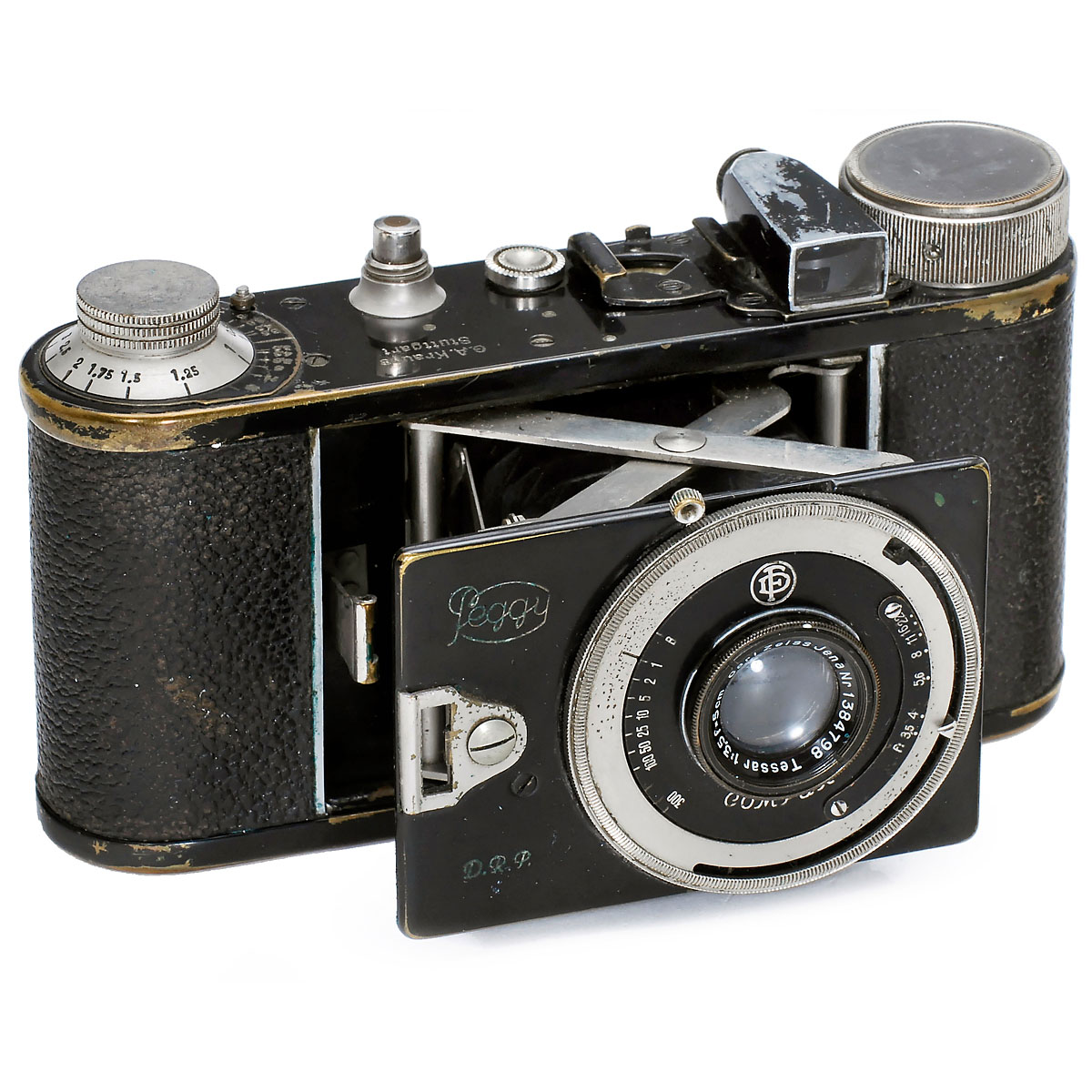 G.A. Krauss, Stuttgart. No. L 132/3, 35 mm strut construction. With Tessar 3,5/5 cm, no. 1384798. Compur shutter 1–1/300 sec., Peggy I instruction manual, lens cap and cassettes. Produced for only one year. – The rarest "Peggy" camera!