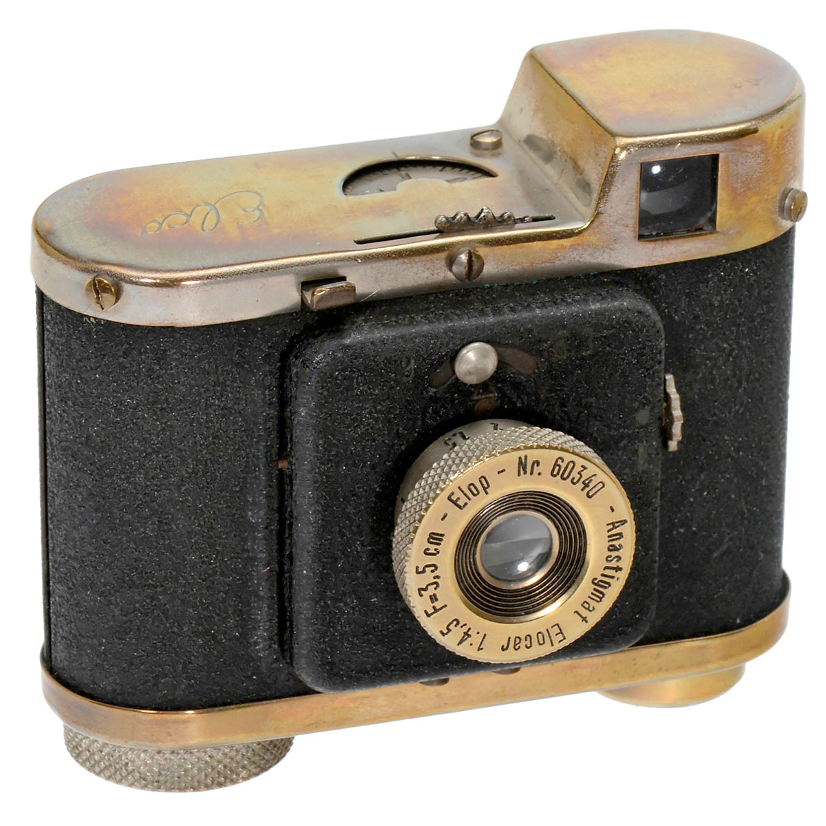 Elop (Electro Optic GmbH), Flensburg. This was one of the very first newly designed German post-war cameras! Size 24 x 24 mm, Anastigmat Elocar 4,5/3,5 cm (no. 60340), shutter I. + B., brass body.