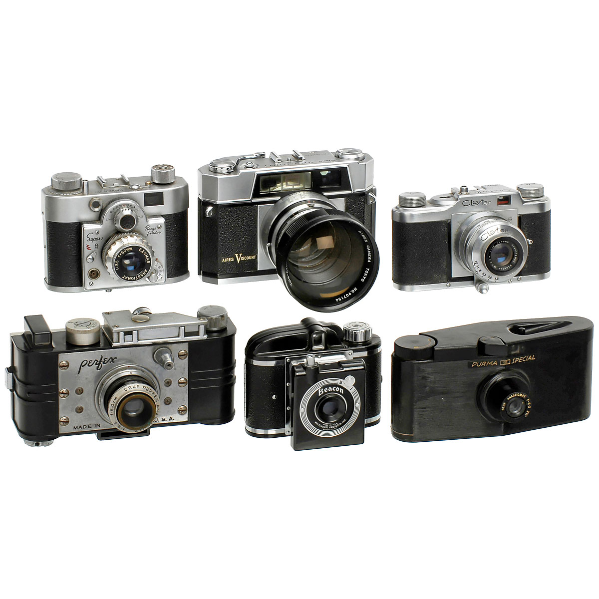 1) Sanei Sangyo, Japan. Samoca-35 Super, 1956, Ezumar Anastigmat 3,5/50 mm, shutter 1/10–1/200 sec. (stuck). – 2) Aires Camera, Tokyo. Aires Viscount 1,9, 1959, H Coral 1,9/4,5 cm, Seikosha-SLV, with "Tele-Attachment 8 cm". – 3) Closter, Italy. Closter IIA, c. 1950, Mizar 4,5/50 mm, shutter 1/25–1/300 sec. – 4) Camera Corp. of America. Perfex, c. 1938, bakelite body, Graf Perfex Anastigmat 3,5/5 cm, shutter 1/25–1/500 sec. – 5) Whitehouse Products, USA. Beacon, c. 1947, 3 x 4 cm, on rollfilm 127, B + I. – And: 6) Purma Camera Ltd., London. Purma Special, c. 1937–51, Beck Anastigmat 6,3/2 ¼ in., gravity shutter, with accessories. – Mixed condition.