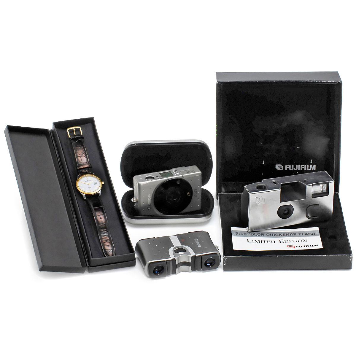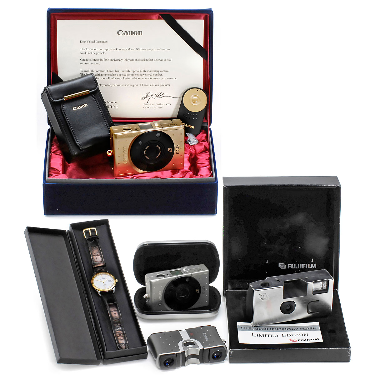 Canon, Japan. 1) Ixus "Gold" Limited Edition, "60th Anniversary" set, no. 000099. Opened for first time for catalogue illustration. Mint! (1/–) – 2) Ixus IX240, with original box "Ixus Limited". (3/–) – 3) Canon "7 x 17 FC Binoculars, design of Ixus camera, with box and case. (2+/1) – 4) Dugena wristwatch with engraving on back: "60th Anniversary Canon", carried, with box. – And: 5) Canon promotional items: compass with Canon sticker, 2 Canon cups, sticker and more. – In addition: Fujicolor Quicksnap Flash (metal body), "Limited Edition", in box.
