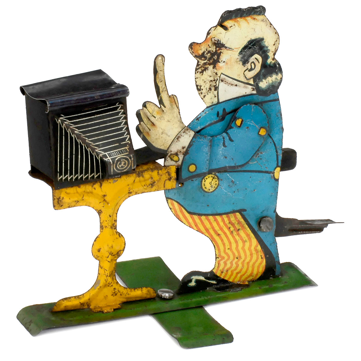 Unmarked. Lithographed figure with lever mechanism for the photographer's left hand and for camera-plate movement, lithographed tin, height 4 ¾ in.