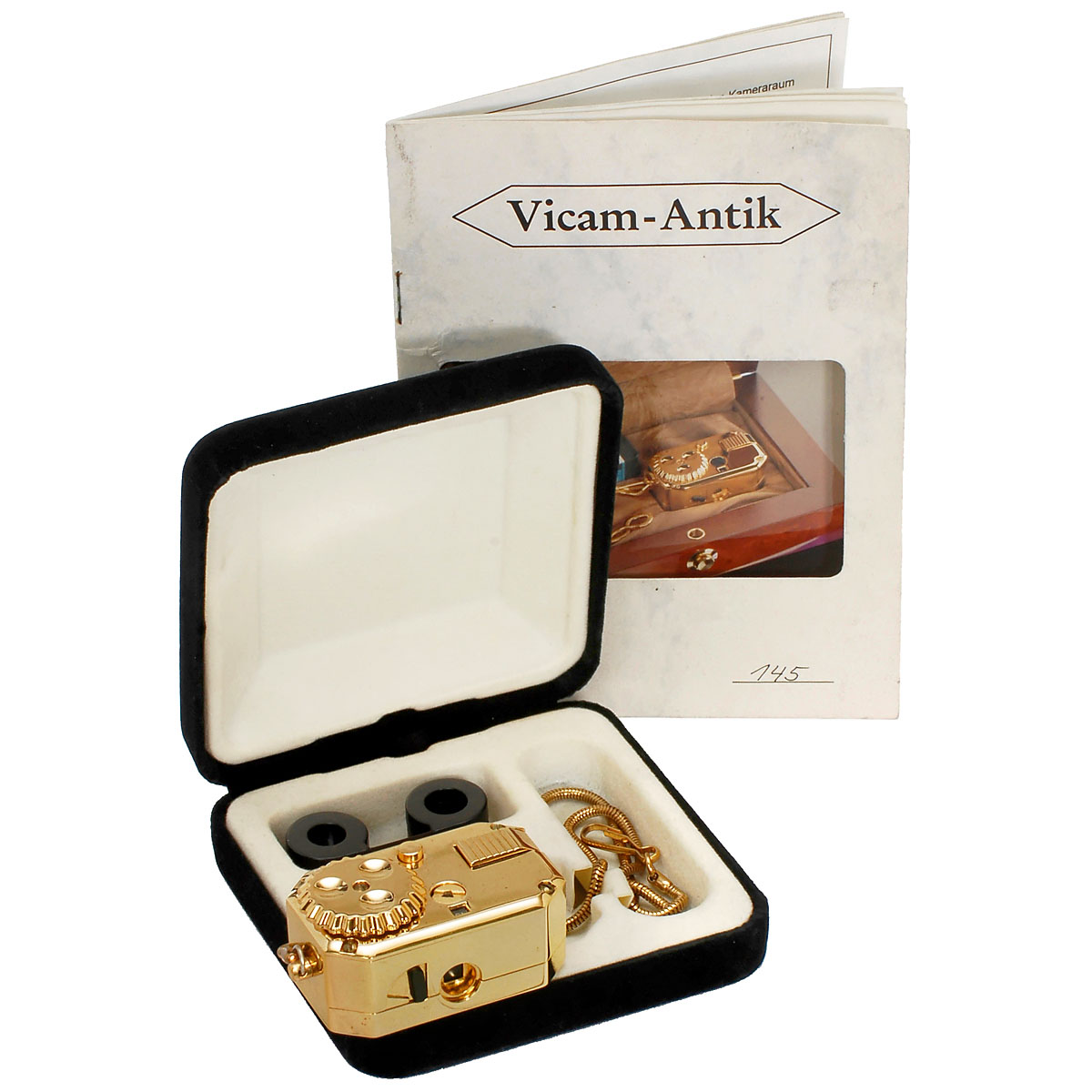 Chad Camera, Siegen. "Made in Berlin", gold-plated handmade camera for Minox film 8 x 11 mm, limited edition, serial no. 145. With casket, chain and instructions.