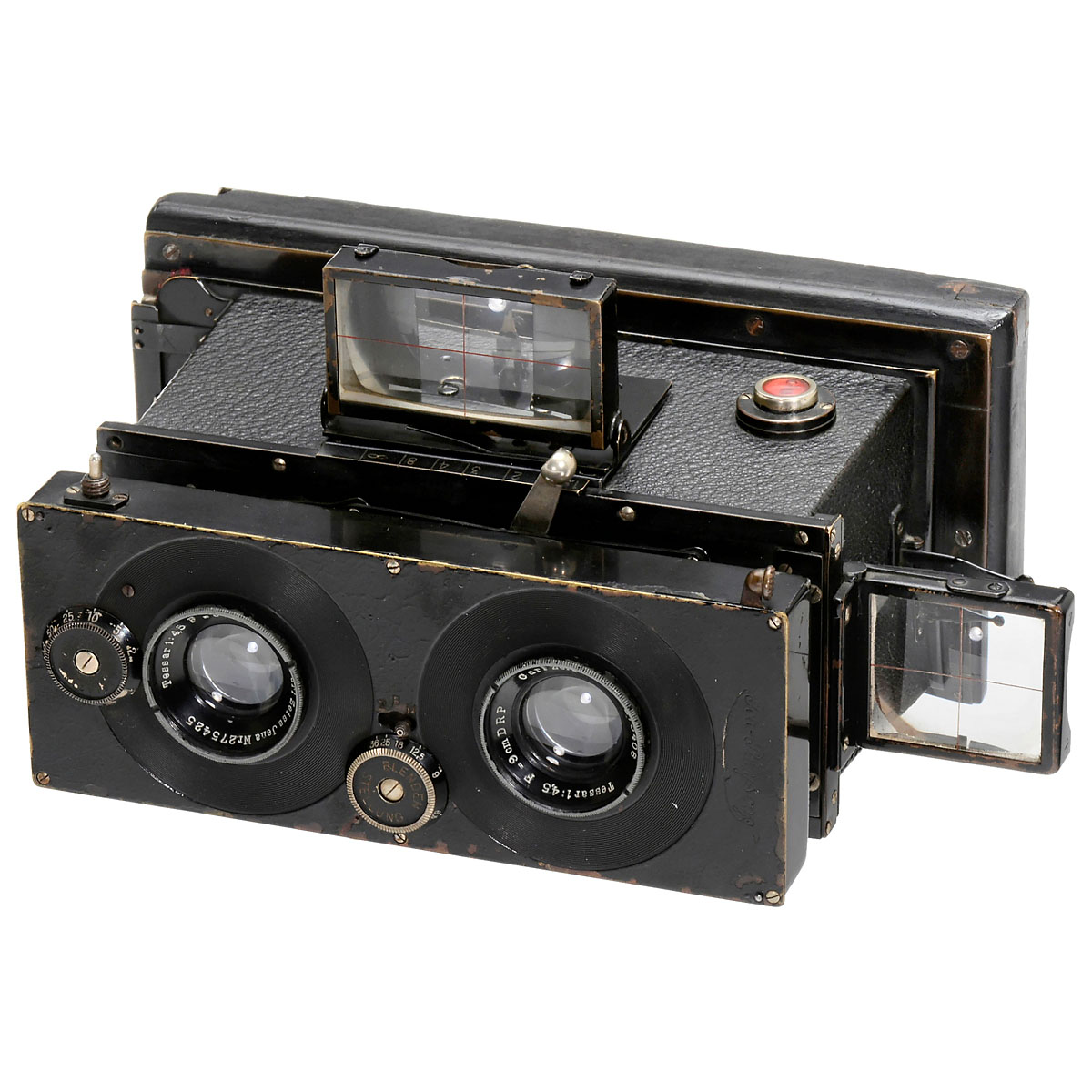 Ica AG, Dresden. 1) Ica Polyscop 6 x 13, c. 1915. Stereo camera and panoramic camera for plates of 6 x 13 cm, lenses: Carl Zeiss Jena Tessar 4,5/9 cm, three-blade shutter Z, B, 1–1/250 sec., iris diaphragms 4,5 to 36, focusing 1,5 m to inf., shifting of one lens into the center possible for panoramic images, two Newton viewfinders, adapted ground-glass back by Contessa Nettel. (3/2–3) – And: 2) Ica Polyscop No. 606 (45 x 107), 1912. Stereo camera for plates and sheet film of 45 x 107 mm, image size 4 x 4 cm, lenses: Ica Dopp.-Anastigmat Maximar 6,8/6 cm, pinhole diaphragms 6,8, 9, 18, guillotine shutter Z, 1/3–1/250 sec., focusing 1 m to inf., reflex viewfinder and folding frame finder, with plate magazine, sheet film magazine and case. (3/3)