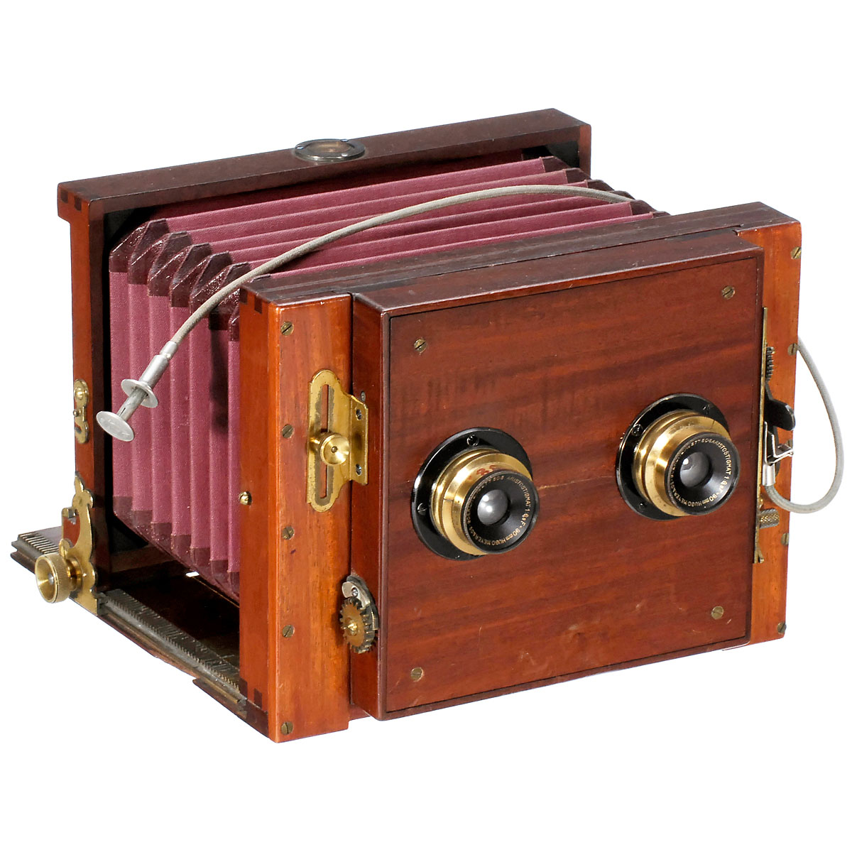 Presumably from England. Plate size 3 ½ x 6 ¼ in., well-preserved mahogany body with unusual brass fittings, dark-red bellows with dark corners, 2 x Aristostigmat 6,8/90 mm with iris stop by Hugo Meyer in Goerlitz, roller-blind shutter with 10 shutter speeds (working sluggishly), shutter-set string missing, focusing screen back. Lens board and baseboard plate with repaired cracks, otherwise in excellent condition.