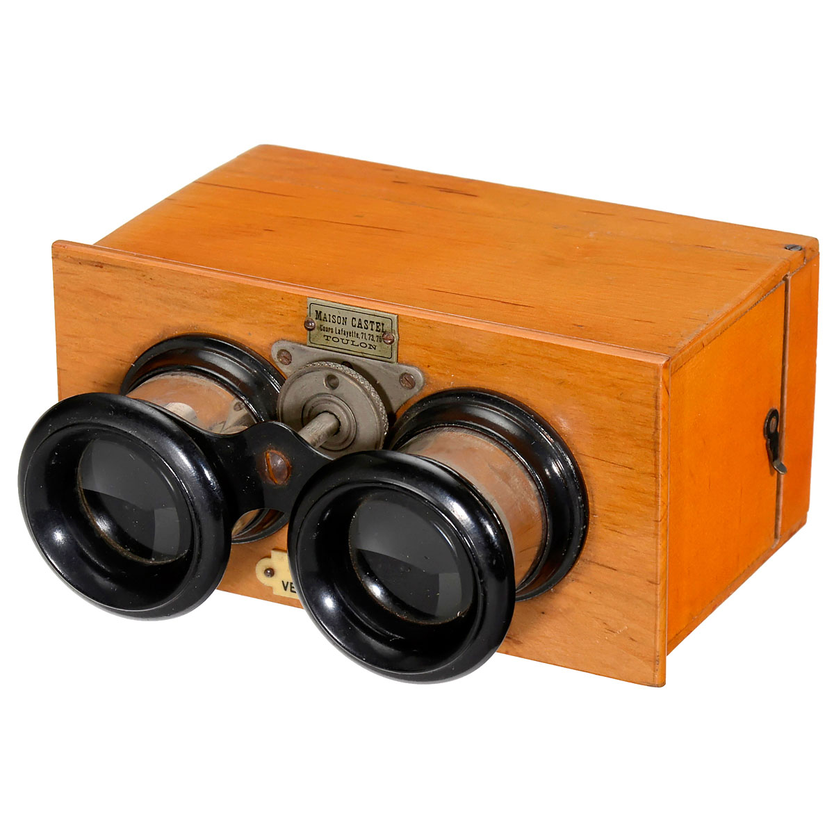 Jules Richard, Paris. Stereo viewer for slides of 45 x 107 mm, focusing by worm drive, wood slightly damaged, with one stereo slide.