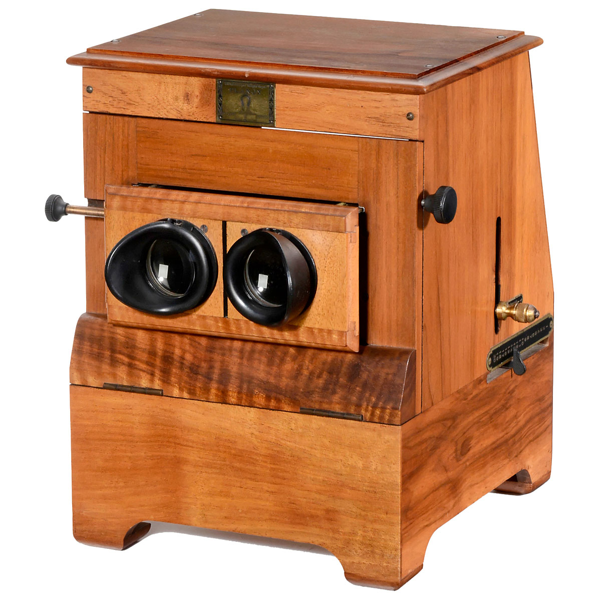 With magnetic pick-up mechanism, manufactured by A. Plocq, Paris. For slides of 60 x 130 mm, with walnut case, rack-and-pinion focusing and adjustable oculars, height 11 ¾ in. With 3 trays and 20 color stereopositives from c. 1900.