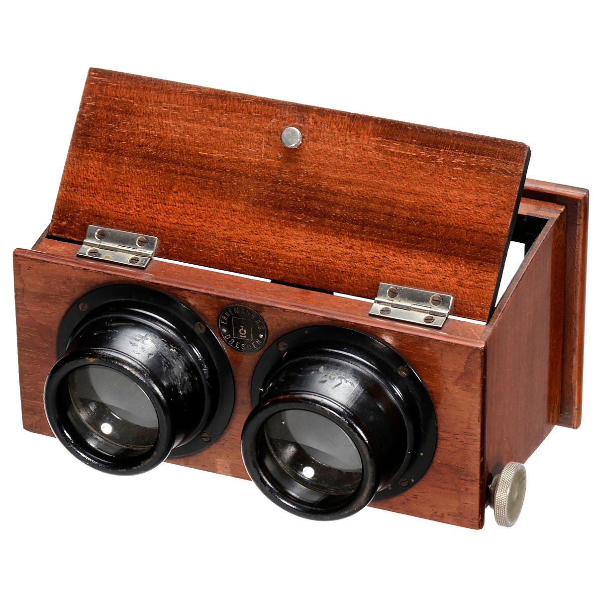1) Ernemann AG, Dresden. Stereo viewer for slides and cards of 6 x 13 cm, rack-and-pinion focusing. (3/2-) – And: 2) A. Mattey, Paris. Stereo viewer for slides of 45 x 107 mm, rack-and-pinion focusing. (3/2-)