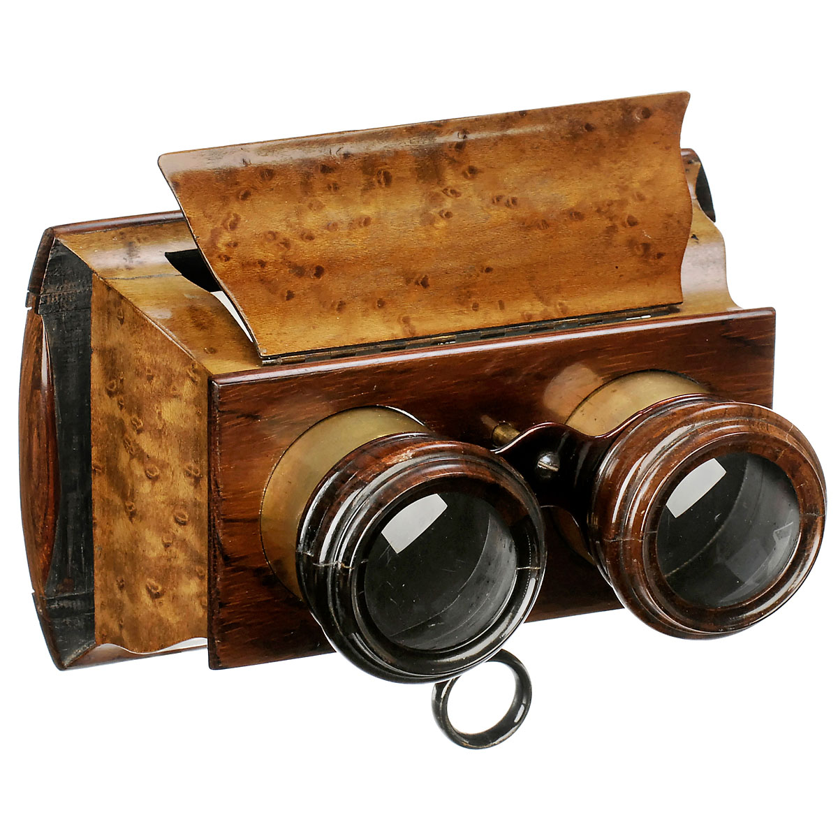 1) Stereoscope for cards and slides of 9 x 18 cm, ogee-form burr-veneered body, unusual focusing via a vertical shaft, diameter of oculars 4 cm, small cracks in the lens holders, ground-glass replaced, rare viewer. (3–4/ 3) – And: 2) Brewster-type stereoscope for cards and slides of 9 x 18 cm, fixed-focus lenses, mirror missing. (3/3)