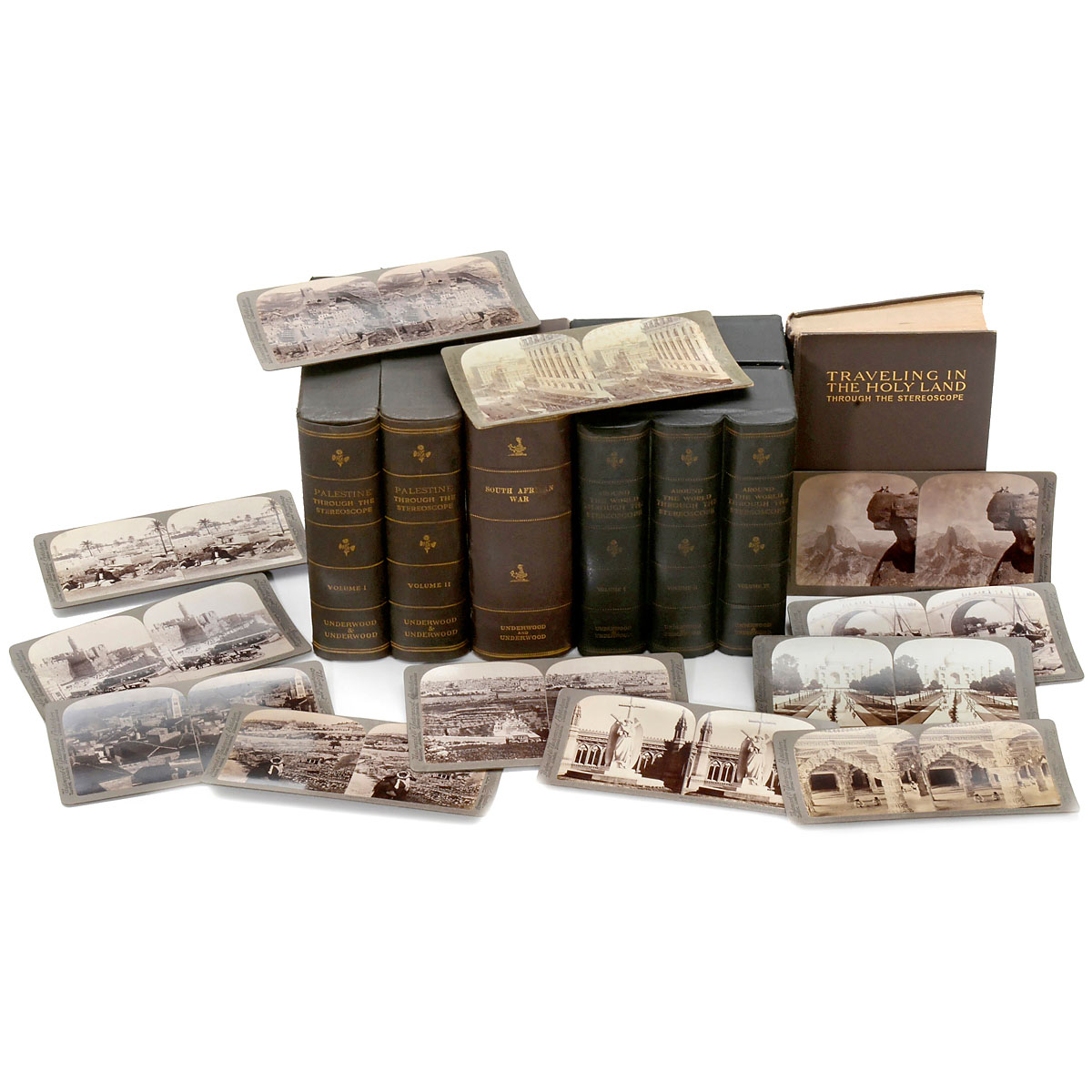 1) "Palestine" Volume I + II, complete set with 100 stereo cards, with original box, 1901. – 2) Box with 34 stereo cards (various). – And: 3) "Around the World", nos. 1–72, nos. 31, 53, 57 and 65 missing, c. 1908. – In addition: Book "Traveling in the Holy Land", 1905.