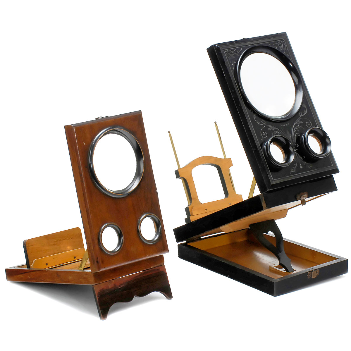 1) French stereo graphoscope, unmarked, c. 1890, black-lacquered wooden body with incised floral decoration, lens Ø 4 in., oculars Ø 1 1/6 in., for stereo cards of 6 x 13 cm and other formats, base-plate slightly uneven, height approx. 14 in. (3+/2) – And: 2) Small stereo graphoscope, polished wood, c. 1880, lens Ø 3 ¼ in., oculars Ø 1 1/6 in., for 6 x 13 cm stereo cards and other formats, height 10 5/8 in. (3/2)