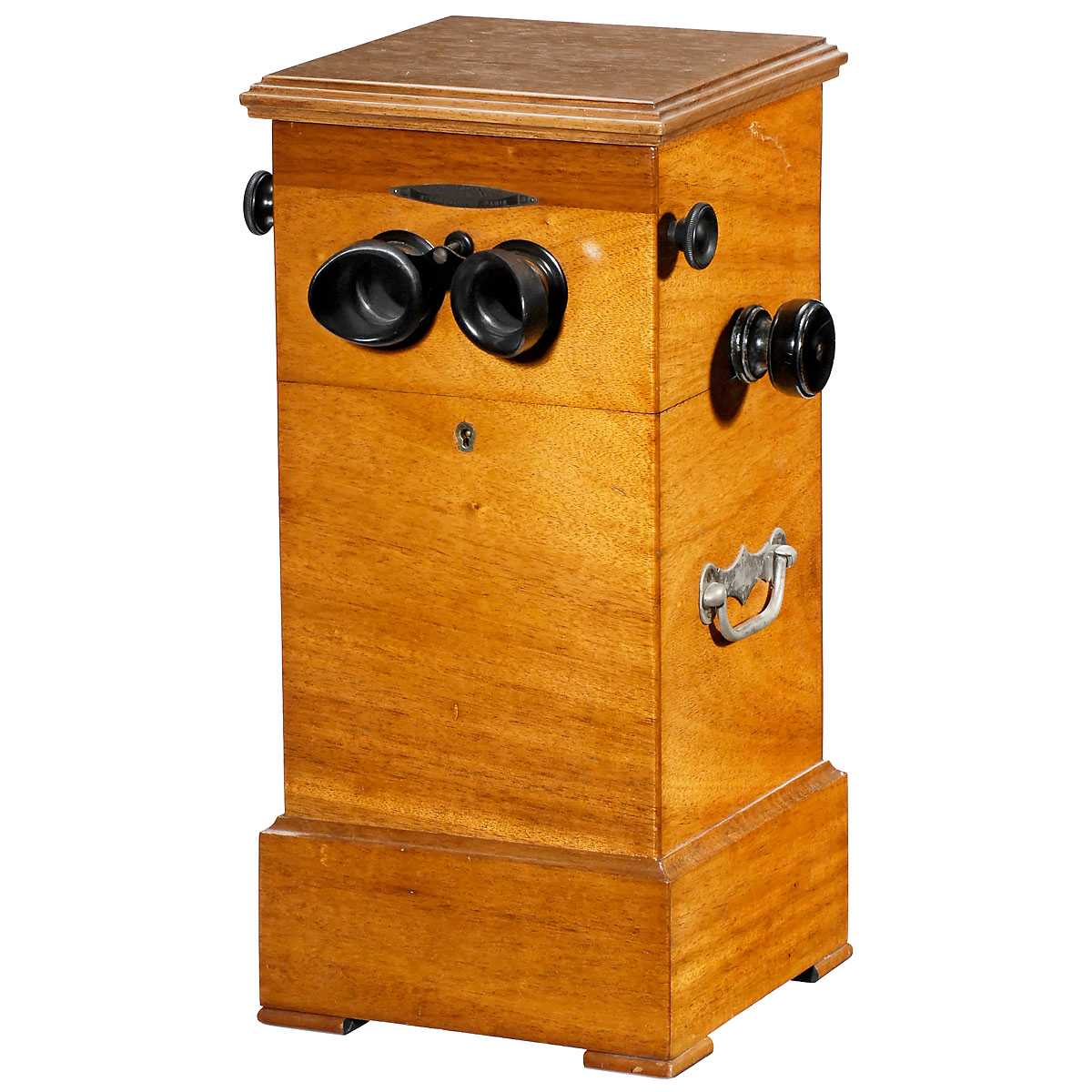 Stéréoscopes – Paris, endless-chain system for 50 stereo slides of 6 x 13 cm, rack-and-pinion focusing, oak case, height 19 ¼ in. With approx. 45 slides.