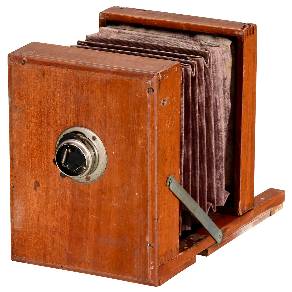 Unmarked, presumably Japanese! Plate size 7 x 10 cm (2 ¾ x 4 in.), polished wood, bellows loose, simple shutter, focusing screen back.