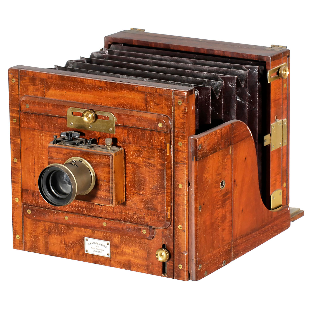 W. Watson & Sons, London. Plate size 8 ¼ x 6 ¼ in., attractive mahogany body with brass fittings, maroon leather bellows, unmarked brass lens (iris stop) in roller-blind shutter (working), and focusing screen back.