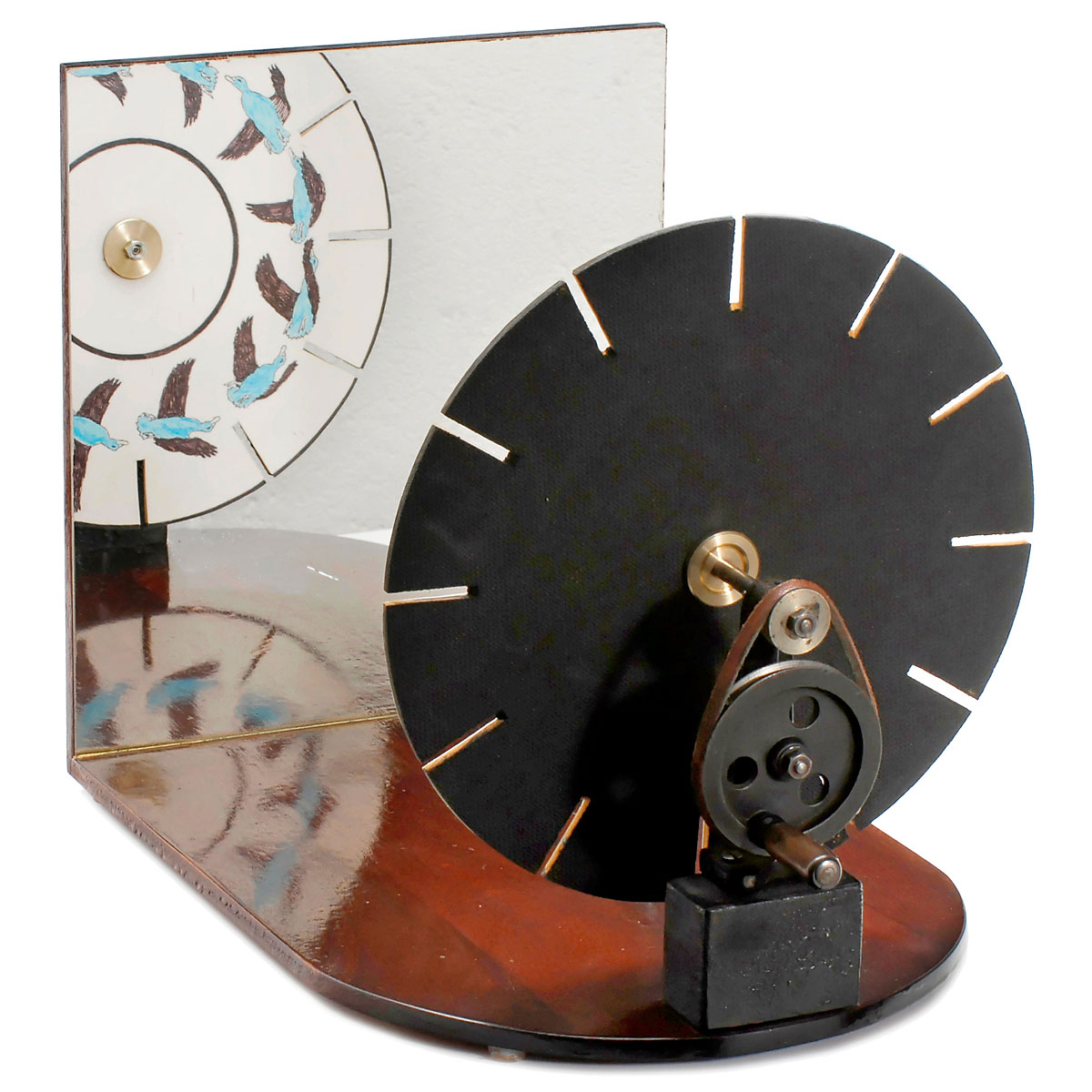 Wooden and steel sheet, crank drive, vertical function, disc diameter 11 2/5 in., motif: flying goose, height of tool approx. 12 ½ in., mirror size 11 3/4 x 12 ½ in., mounted on wooden board. – Formidable functioning and demonstration model.