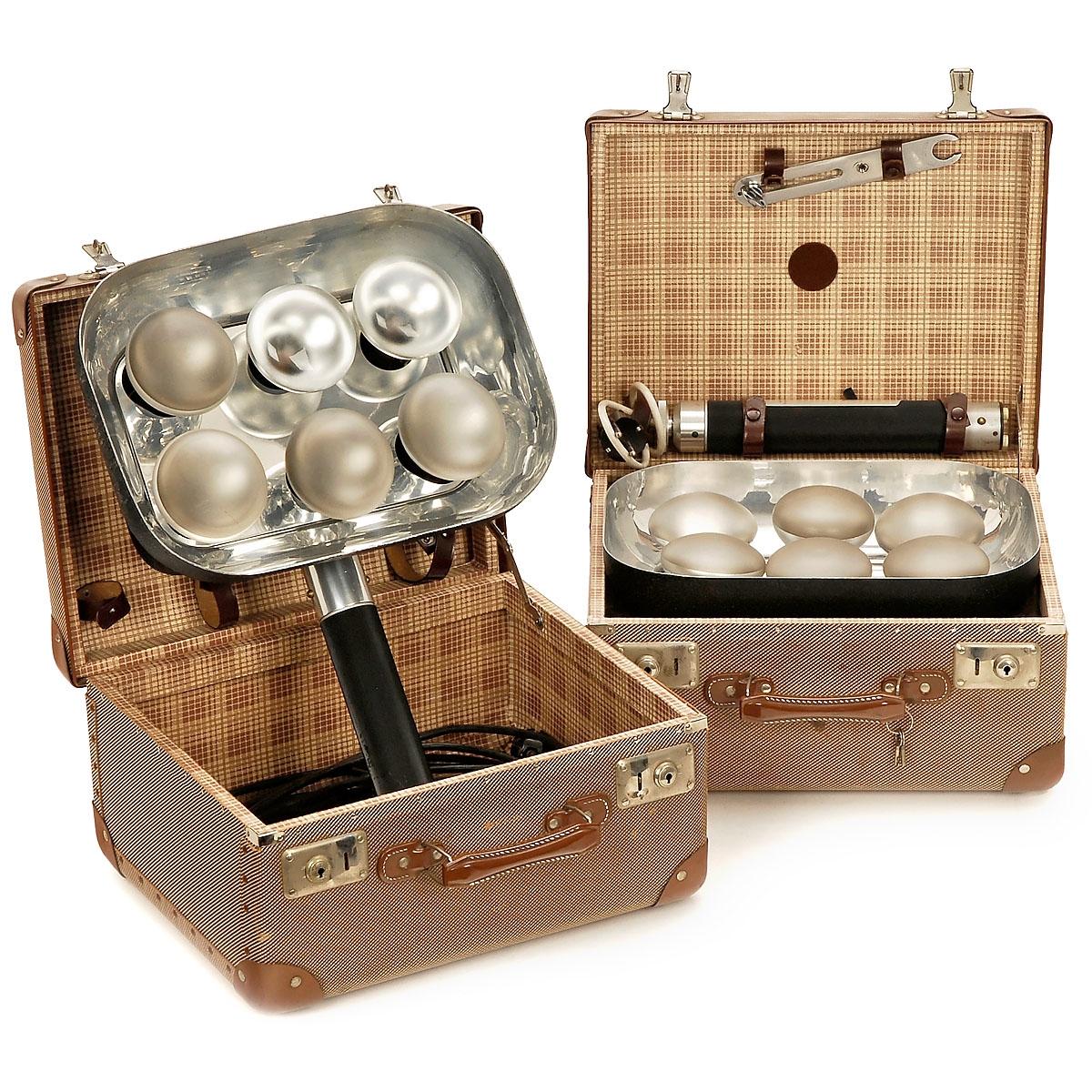 "Foki D.P. MB A.P.a. Germany". 2 light tanks, both illuminated by 6 Nitraphote bulbs (à 250 watt = 1.500 watt), both with grip and case.