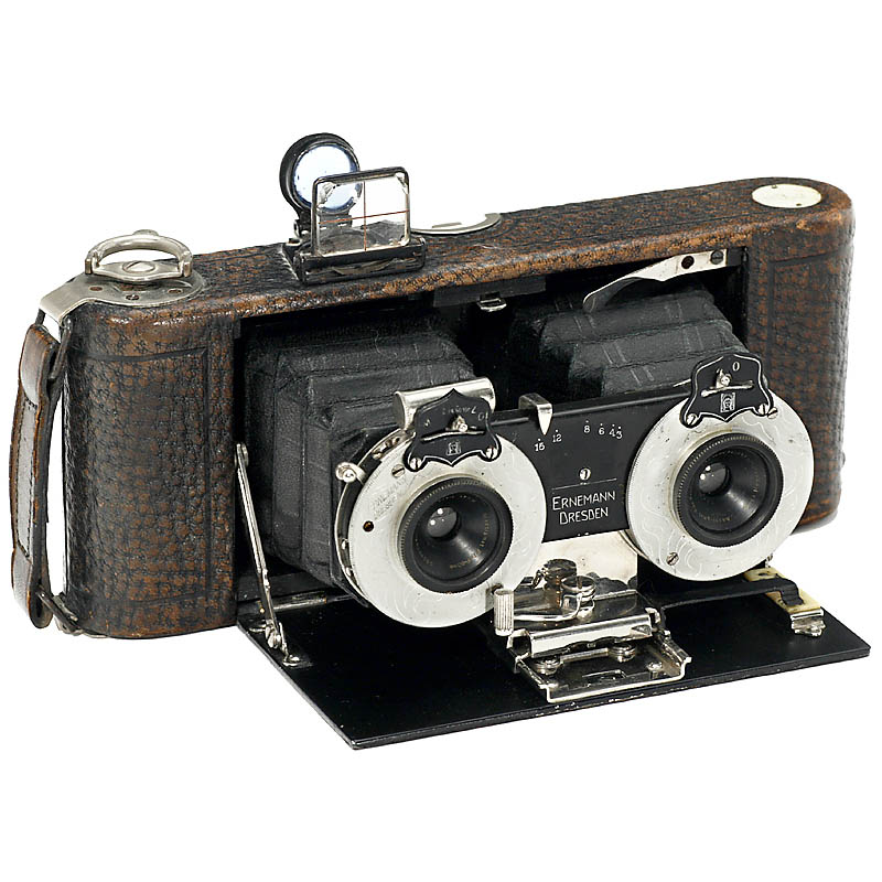 Ernemann,Dresden.立体折叠照相机,胶卷和平板4.5x10.7cm,2xAnastigmat 7.2/60mm by Meyer Goerlitz,Ernemann 快门 速度1/2-1/100秒,取景器是新装的,没有对焦屏后背,有盒带。