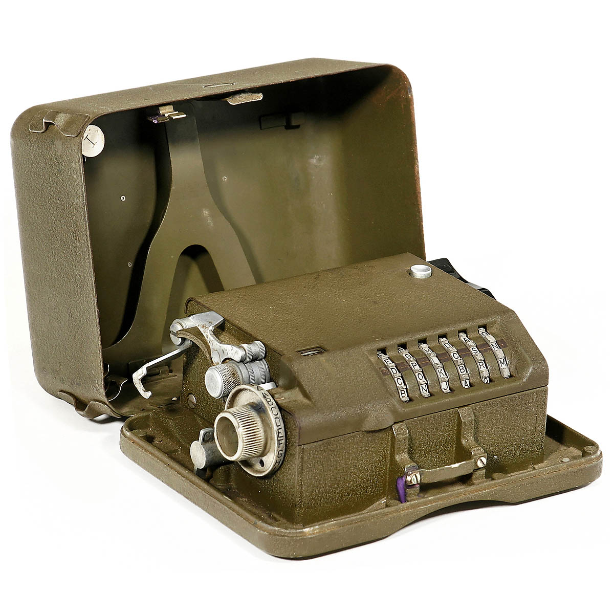 By L.C. Smith & Corona Typewriters Inc. according to the Swedish Hagelin-Cryptos system. WWII cipher machine "Hagelin Converter", portable OSS type M-209-B Converter Signal Corps, no. 6663. Used in the field to encrypt and decrypt messages. It is designed to provide a high degree of security when operators are fully indoctrinated in the necessity of strict compliance with security measures. The code was changed each day by selecting a different setting for the rotors. The operator could keep the machine on his knee in the field or when en- or deciphering in a moving vehicle. – Rare, not to find in Europe! With original manual, bag and spare paper rolls!