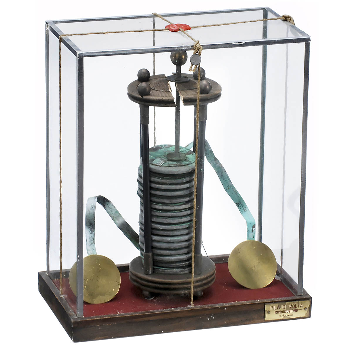 Detailed copy by G. Guatterini, consisting of 16 copper-zinc elements and 2 electrodes, in glazed case, height 12 ½ in., upper section cracked.