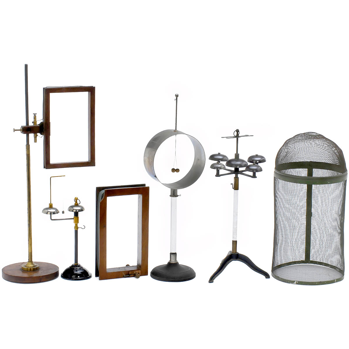 1) Hollow metal cylinder, on glass pillar, height 18 7/8 in. – 2) Faraday cage, height 15 in. – 3) 2 electric chimes, one incomplete. – And: 4) 2 rectangular frames with coils, one on stand.