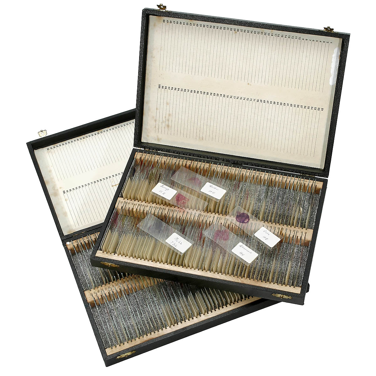 No. 90429, original lacquered brass, black painted cast-iron horseshoe base, double mirror, condenser, triple nosepiece, 3 objective lenses, 4 oculars, height 11 in., in matching mahogany case with the corresponding serial number. Including 2 boxes with human specimens.
