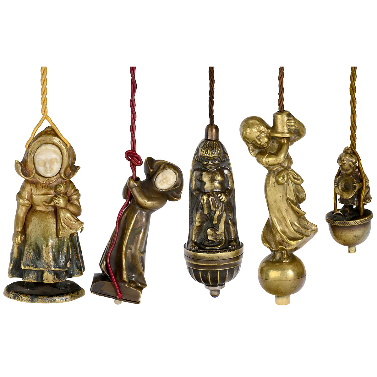 1) Girl with doll, bronze, carved bone head acts as a switch, embossed number 0782 on the base, height 3 in. – 2) Woman, finely carved bone face, bronze, height 2 ½ in. – 3) Double-sided relief of a mischievous boy, bronze, height 3 ¾ in. – 4) Girl catching butterfly with hat, bronze, height 2 1/3 in. – And: 5) Graceful girl, bronze, signed "A. Tereszczuk", Vienna, height 4 ½ in.